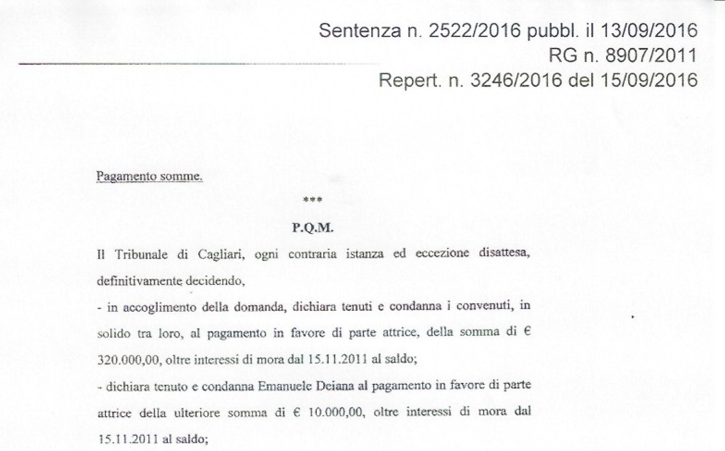 All’esito del procedimento il Tribunale ha decretato la condanna nei confronti del Deiana e della Cadinu, in solido tra loro, al pagamento della somma di euro 320.000. La condanna nei confronti del solo Deiana, al pagamento di ulteriori euro 10.000, dal medesimo prelevata in contanti oltre al pagamento delle spese legali.