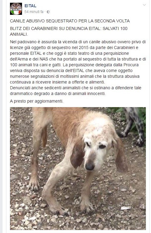 Dopo il sequestro di due anni fa compiuto dal marpione antonio colonna di eital (un nome una garanzia) richiamai Emma invitandola a non prendere più Animali fino a quando non si fosse messa in regola con il suo Rifugio. Non mi ascoltò e quella di ieri è la tragica conseguenza. Nel verbale dei carabineri di Castelbaldo, risulta un sequestro preventivo della struttura per la mancanza dei permessi e un’indagine per maltrattamento tutta da verificare che finirà come la precedente: archiviata! Ma colonna e i suoi compari non lo dicono.