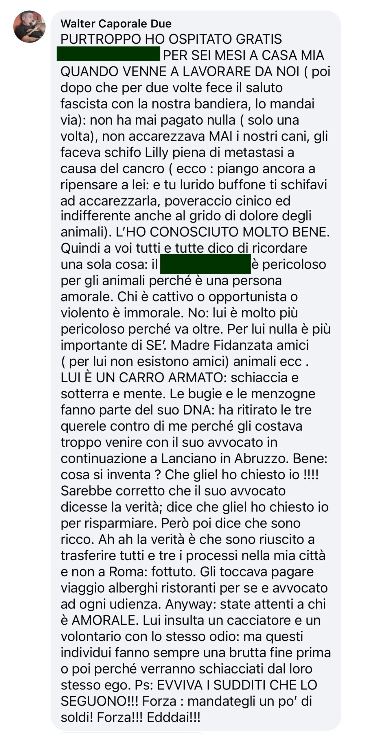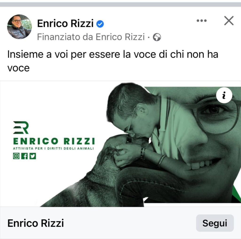 Recentemente Enrico Rizzi ha pubblicato l’ennesimo post diffamatorio nei confronti Di Paolo Mocavero, ha pubblicato foto e messaggi privati (datati), beccherà un’altra denuncia, contento lui contenuti tutti. Ha accusato Paolo di aver approfittato di lui lo scorso agosto, ha detto che gli aveva pagato treno e hotel, ma si è ben guardato di dire che Paolo in quel periodo stava aiutando una Gattara, quindi non poteva impegnare del denaro per un spostamento a Roma, Rizzi quindi si offrì di pagare le spese. Certo che rinfacciare 150 euro, al massimo 200, dopo aver insistito per ore, fa di questo omino un miserabile. Il signorino ha iniziato ad attaccarci da quando l’abbiamo mollato, avevamo scoperto i suoi loschi intrallazzi. Chi specula sugli Animali deve essere emarginato.