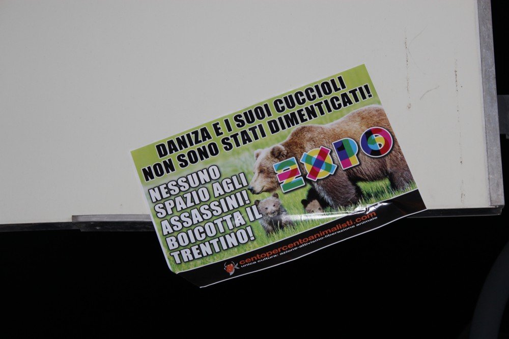“DANIZA E I SUOI CUCCIOLI NON SONO STATI DIMENTICATI” “Nessuno spazio agli assassini – boicotta il Trentino”: questo è il messaggio scritto sulle locandine adesive affisse nella notte tra 25 e 26 gennaio dai militanti di CENTOPERCENTOANIMALISTI sui cancelli della sede dell’EXPO sita in via Pisacane, 1 a Pero (Milano) e altre zone confinanti.