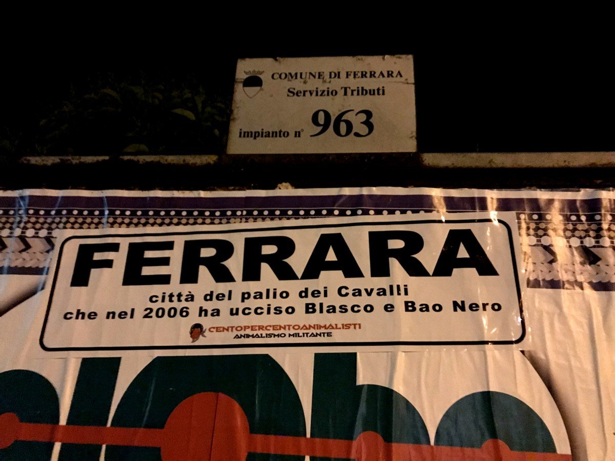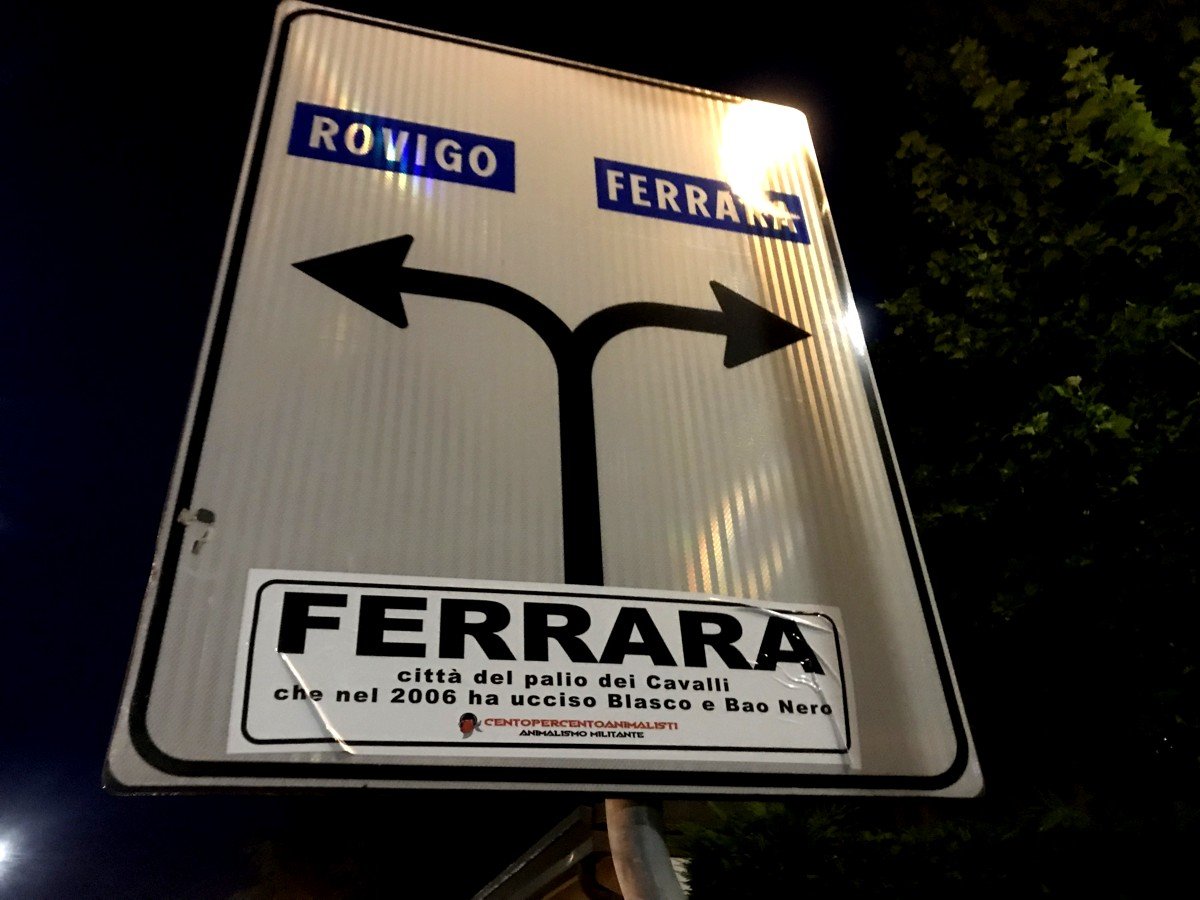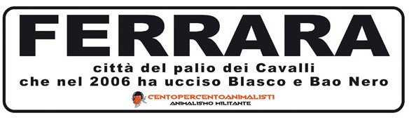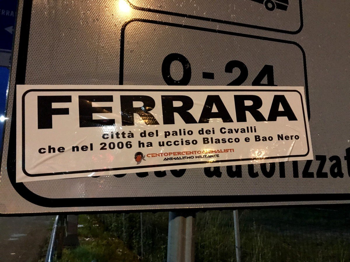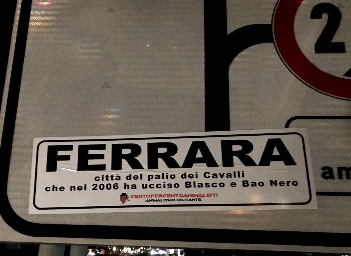 Per ricordare i due Cavalli uccisi a Ferrara, nella notte tra il 21 e 22 maggio, militanti di CENTOPERCENTOANIMALISTI hanno affisso con striscioni adesivi “particolari” i cartelli stradali periferici, d’ingresso in città e ovviamentente in Piazza Ariostea.