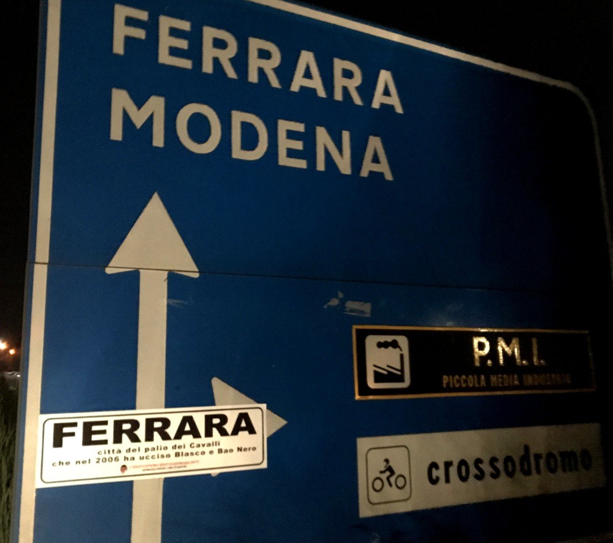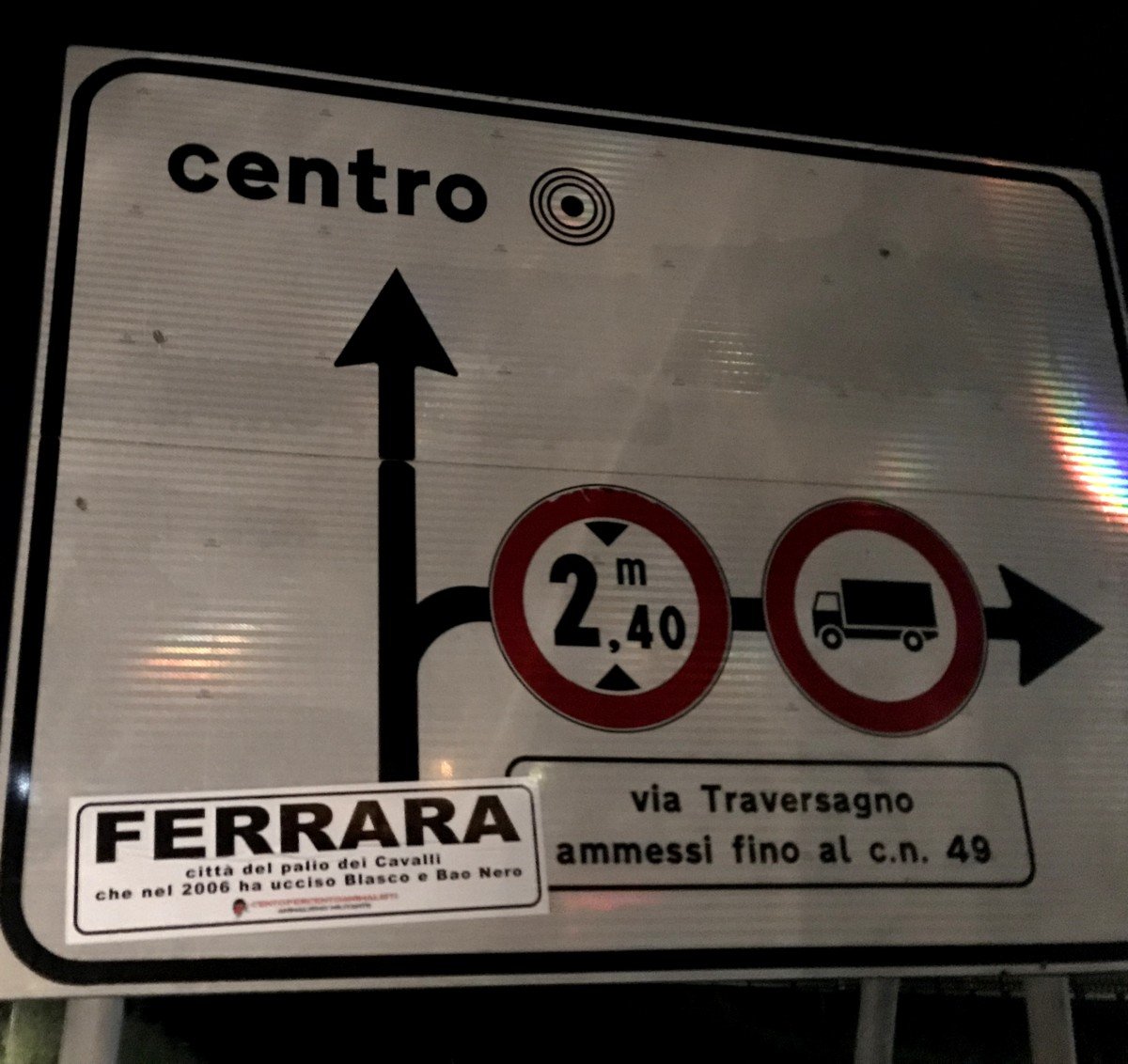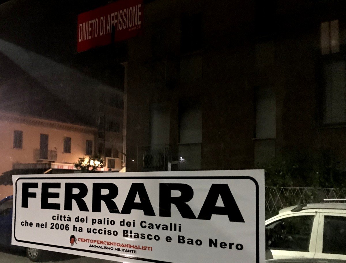 Per ricordare i due Cavalli uccisi a Ferrara, nella notte tra il 21 e 22 maggio, militanti di CENTOPERCENTOANIMALISTI hanno affisso con striscioni adesivi “particolari” i cartelli stradali periferici, d’ingresso in città e ovviamentente in Piazza Ariostea.