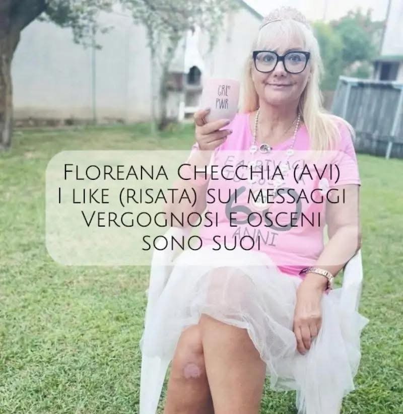 Alle mostruosità che hanno proferito le due miserabili, si aggiungono le risate di quest’altra attempata, Floreana Checchia, un’altra anziana donna frustrata che pratica il body shaming, pensate che si era permessa di fare dello spirito nei confronti di Paolo, ma ne riparleremo a breve con articoli dedicati a lei e alle altre disagiate del suo gruppo, figlia del balilla sporcaccione compresa. Da notare che filtra tutte le foto per apparire decente, ma la realtà è impietosa…