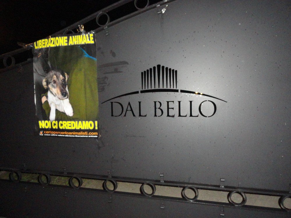 Chi supporta questi signori è complice! Nella notte tra il 5 e 6 maggio, militanti di Centopercentoanimalisti hanno affisso sui cancelli della ditta “Dal Bello” a Fonte (Treviso) manifesti  con l’icona dei cacciatori Pietro Pacciani, di liberazione animale e  uno striscione di condanna contro la ditta produttrice di vini omonima, sponsor ufficiale del vergognoso evento di Asolo.