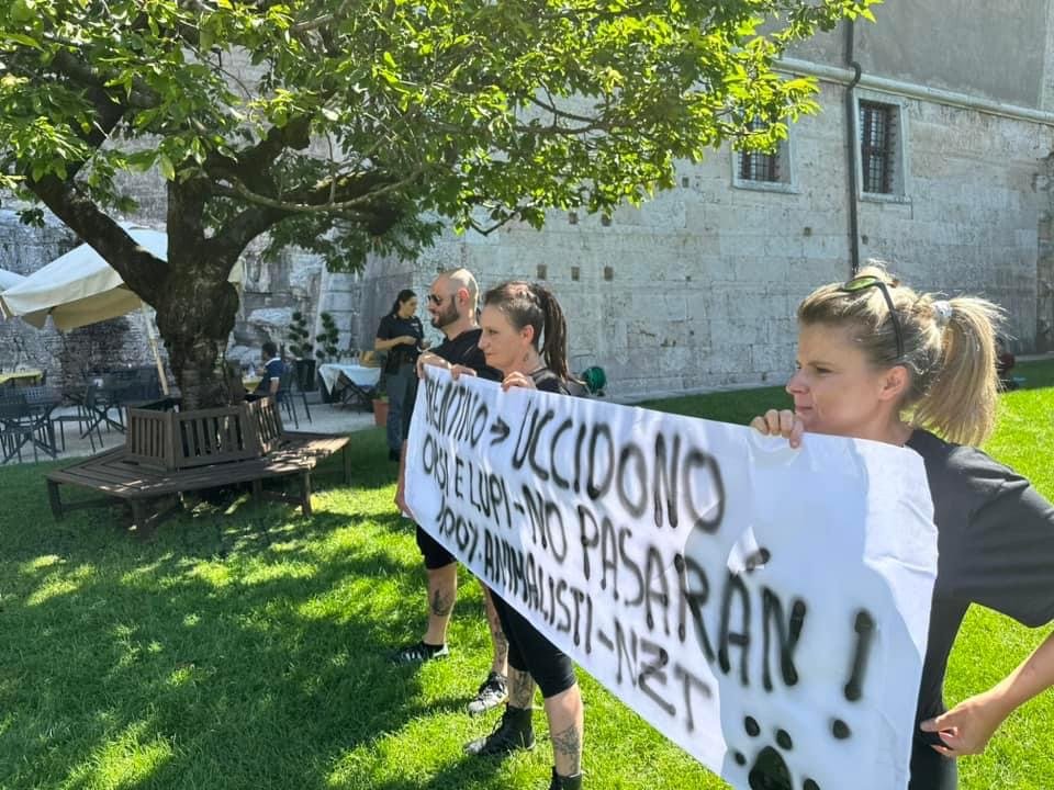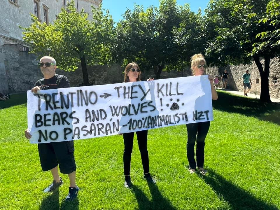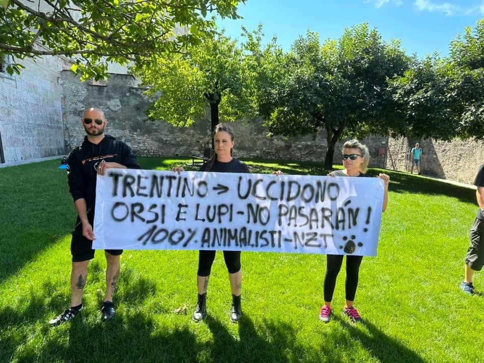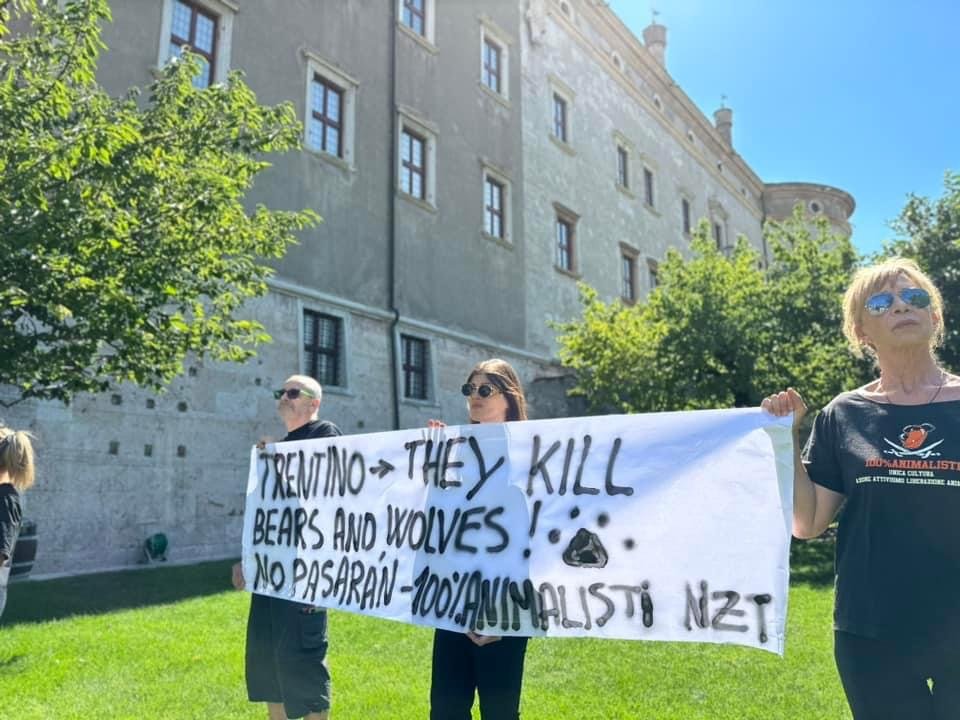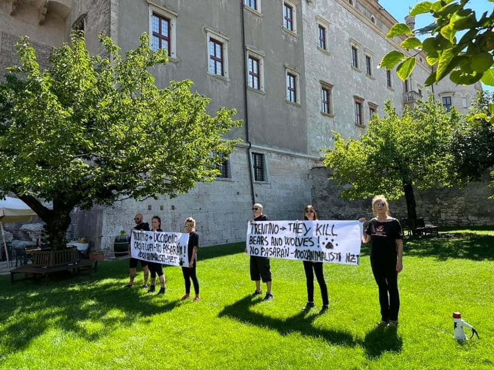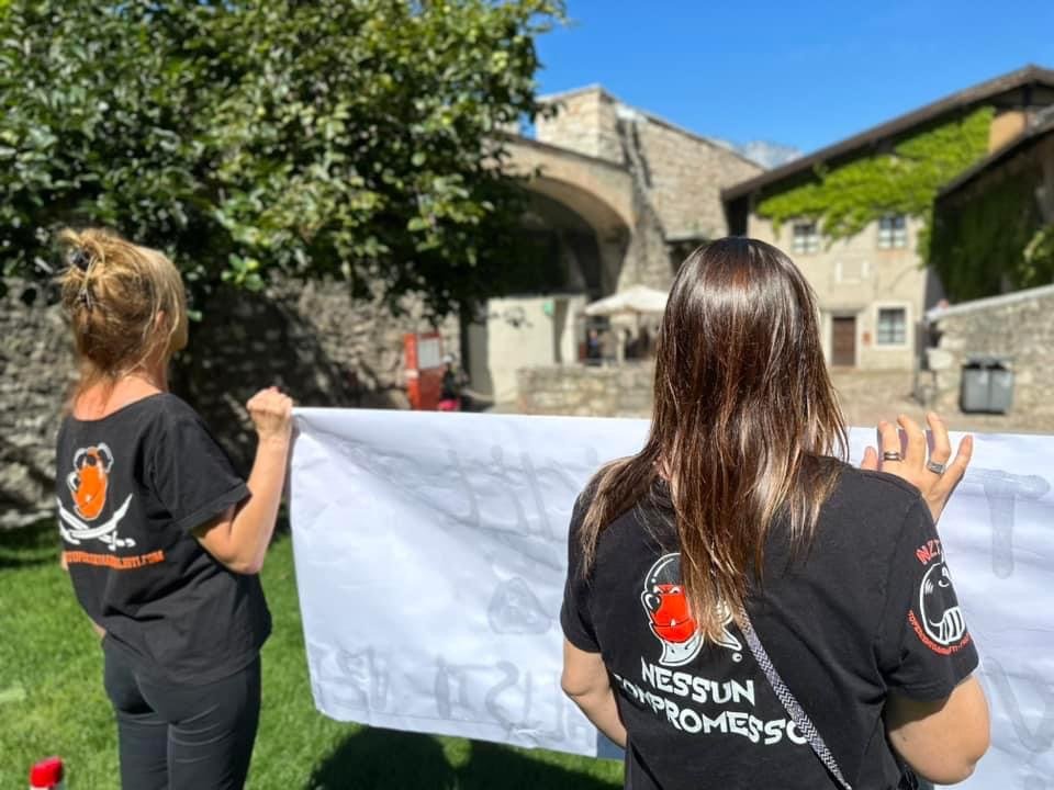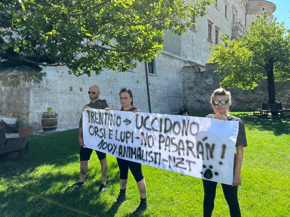 CASTELLO DEL BUONCONSIGLIO (TRENTO). I turisti, pochi ed un buon segno, in visita al castello, hanno assistito ed immortalato con delle foto il blitz approvando la protesta. I dipendenti della struttura hanno chiamato le FdO che una volta arrivati, hanno identificato i Militanti. Da segnalare un fatto spiacevole, tanto per confermare la mentalità dei sudditi di Fugatti: è stato vietato l’ingresso ad un Cane (lo trovate nel video) perché di grossa taglia. I Militanti hanno attaccato successivamente uno striscione (riciclato da Genova) sui cancelli della sede provincia autonoma di Trento