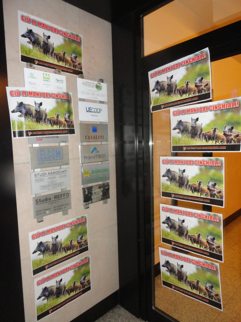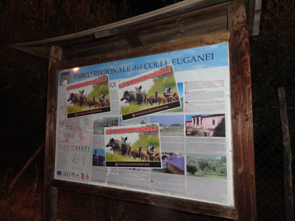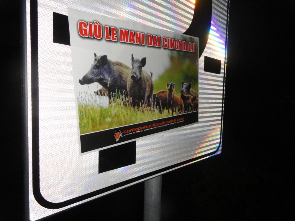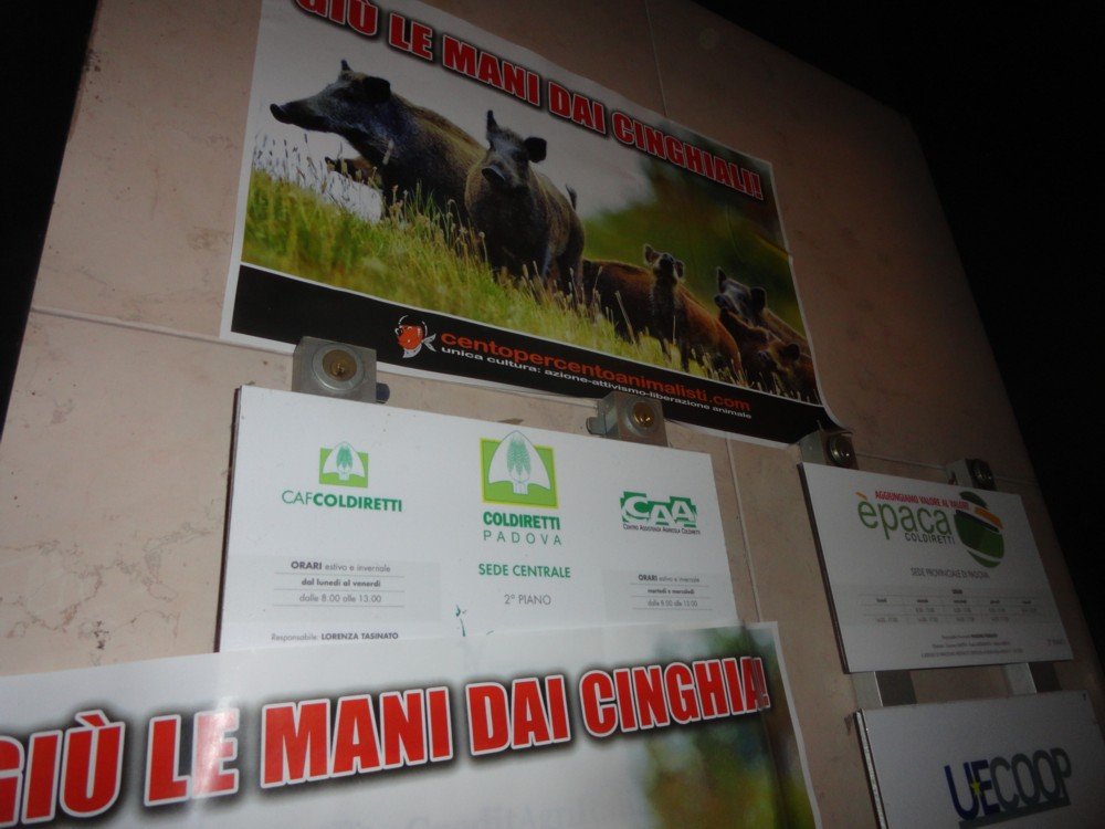 Contro la mattanza dei Cinghiali, e di qualsiasi altro Animale, militanti di CENTOPERCENTOANIMALISTI, nella notte tra il 28 e 29 settembre, hanno affisso numerose locandine adesive alla Coldiretti a Padova e tappezzata la città del sindaco/presidente Arquà Petrarca, municipio compreso.