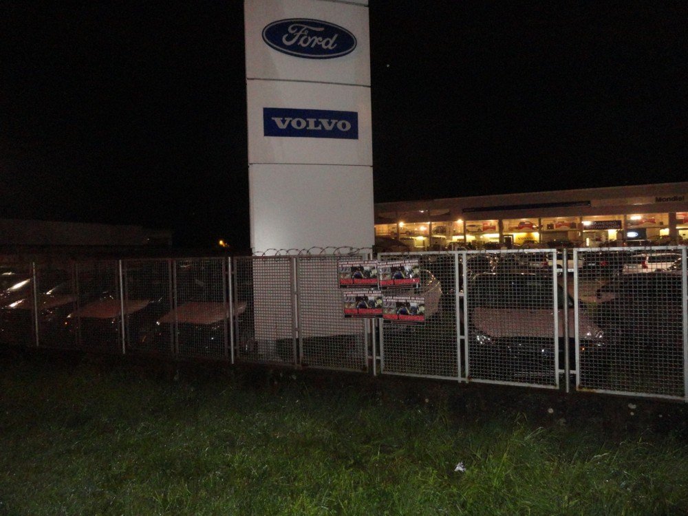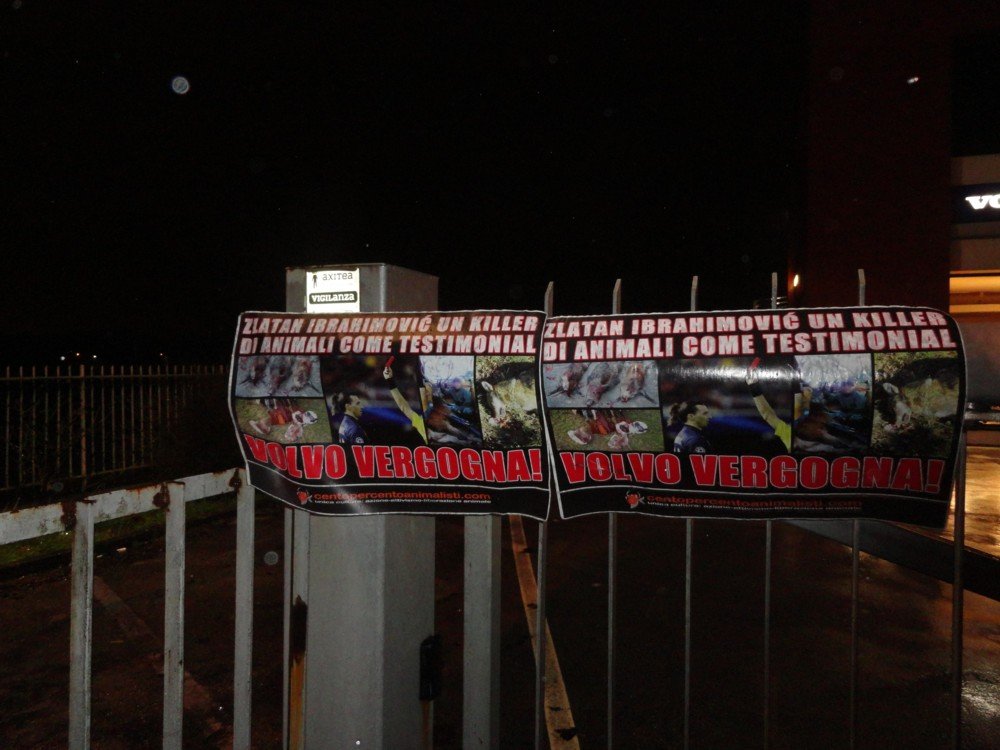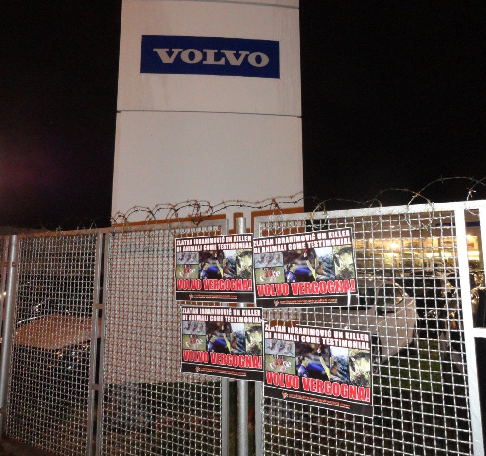 Nella notte tra il 27 e 28 gennaio militanti di Centopercentoanimalisti hanno “colpito” le concessionarie Volvo di Padova (Modial Car), Vicenza (Bisson Auto), Treviso (Volmecc) e Mestre (Mondial car), affiggendo numerose locandine (già usate a Bologna giovedì scorso) contro Zlatan Ibrahimovic e la nota azienda Svedese.