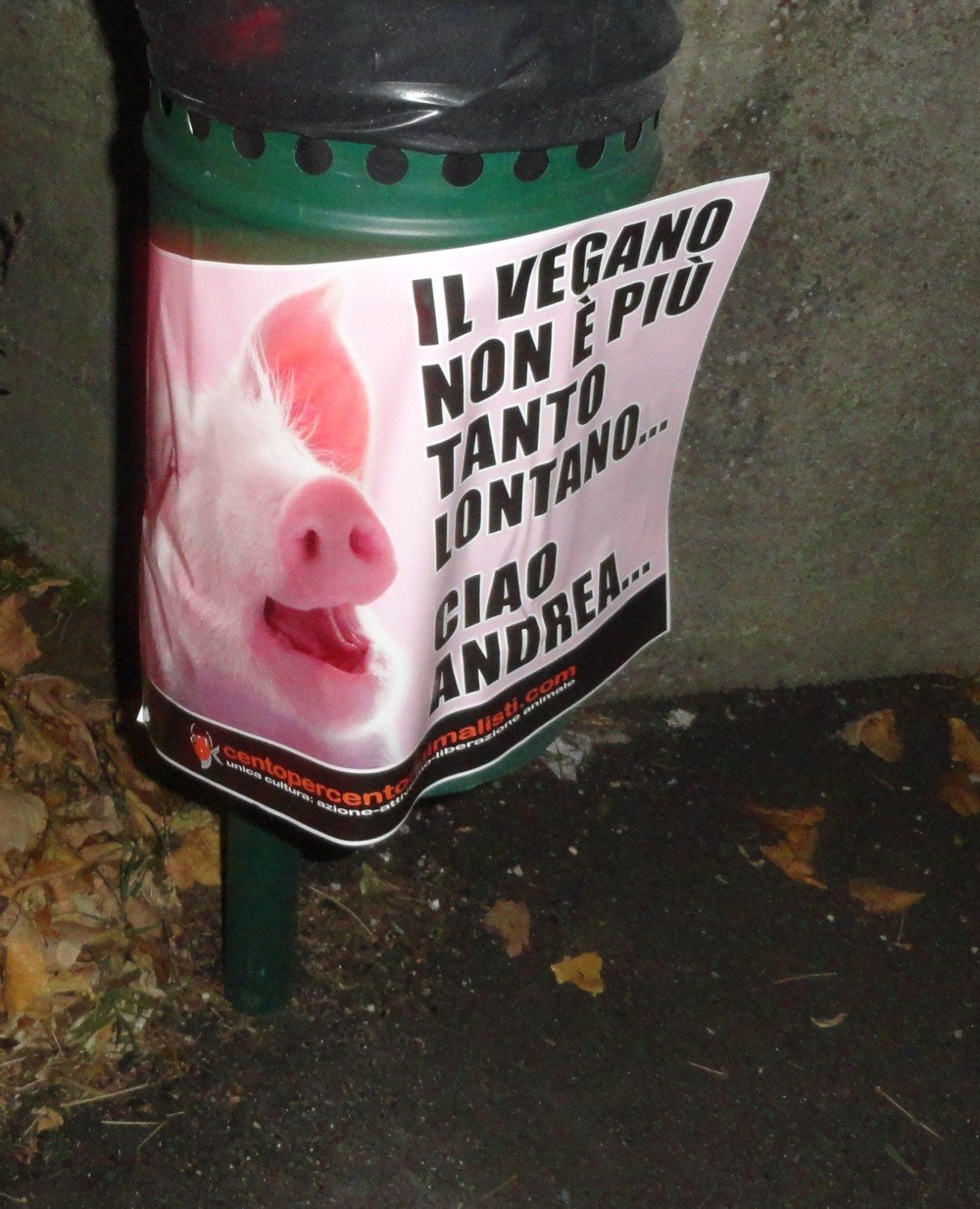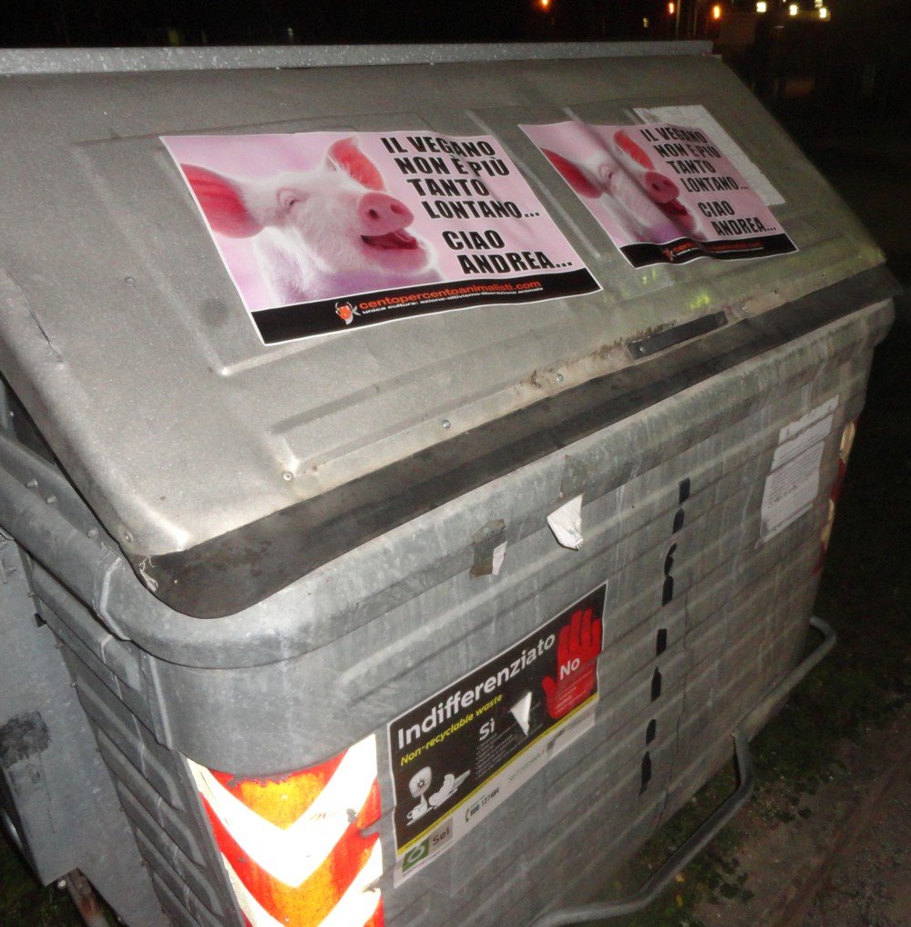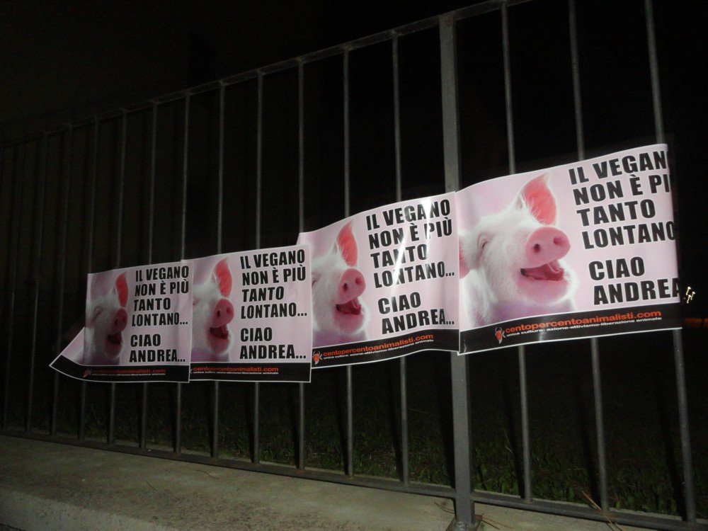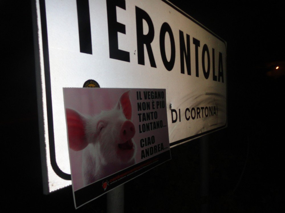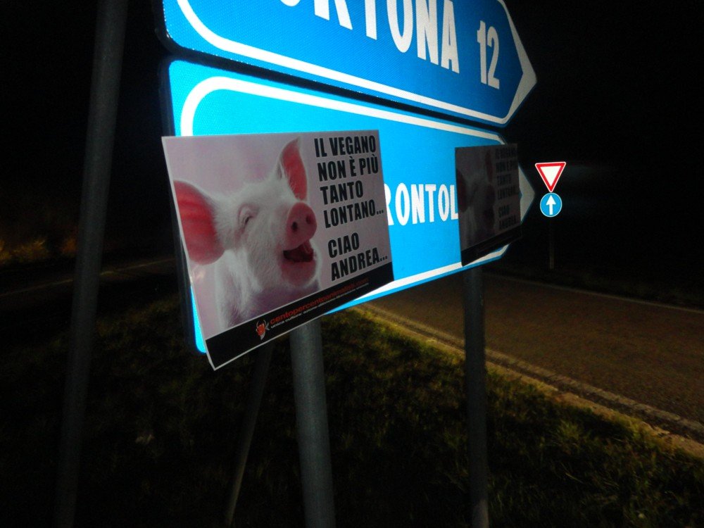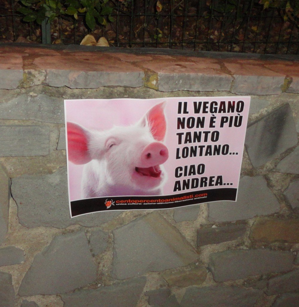 Nella notte tra il 3 e 4 novembre, alcuni militanti locali di Centopercentoanimalisti hanno tappezzato il paese e l’abitazione del nostro eroe, precisamente a Terontola in provincia di Arezzo. La via della sua abitazione porta il nome di un famosissimo scrittore/poeta nato ad Arezzo e morto in provincia di Padova, destino!