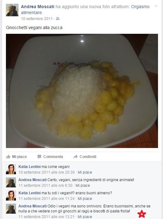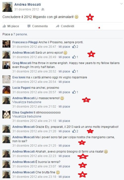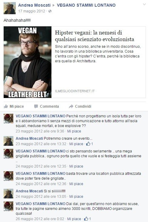 Prima di arrivare al dunque, una piccola premessa. Avevamo scritto in data non sospetta che la pagina di Andrea Moscati (questo è il suo nome e cognome) era stata momentaneamente oscurata dallo stesso. Alcuni noti babbei del mondo animalfesso avevano creato precedentemente un evento per far chiudere la suddetta pagina, cantando vittoria e credendo di essere riusciti per davvero nell’impresa. Per la cronaca, da quando facebook è quotato in borsa, raramente sono state chiuse pagine segnalate, salvo che per pedofilia, pornografia e razzismo.