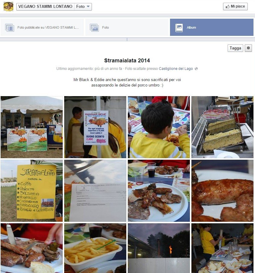 La pagina vegano stammi lontano è nata nel 2010, rimasta anonima per tutto il 2011 (il tipo si esaltava per 100 like) e gran parte del 2012. Il suo creatore è tale Andrea Moscati, toscano di 44 anni compiuti lo scorso 1 novembre (piaciuto il nostro regalo di compleanno?). Andrea, alias “Mr Black” e “Mirco l’inviato”, non ha creato solo quella pagina, ne ha create molte altre, numerose sullo stesso filone anti animalista, altre per la sua passione (i treni) e altre contro Vasco Rossi. Oltre alla carne e gli Animali morti, ama i dolci. Fateci caso, nella pagina vegano stammi lontano, sono numerosissime le foto di “arte” pasticcera. Con il toscano collaborano alcuni suoi conoscenti, anche di loro sappiamo tutto e che faccia hanno, ma al momento ce lo teniamo per noi. Amicissimo dei principali esponenti vivisettori pro test, ha stretto una alleanza con loro per fondare altre pagine con lo scopo di ridicolizzare gli Animali e gli Animalisti.