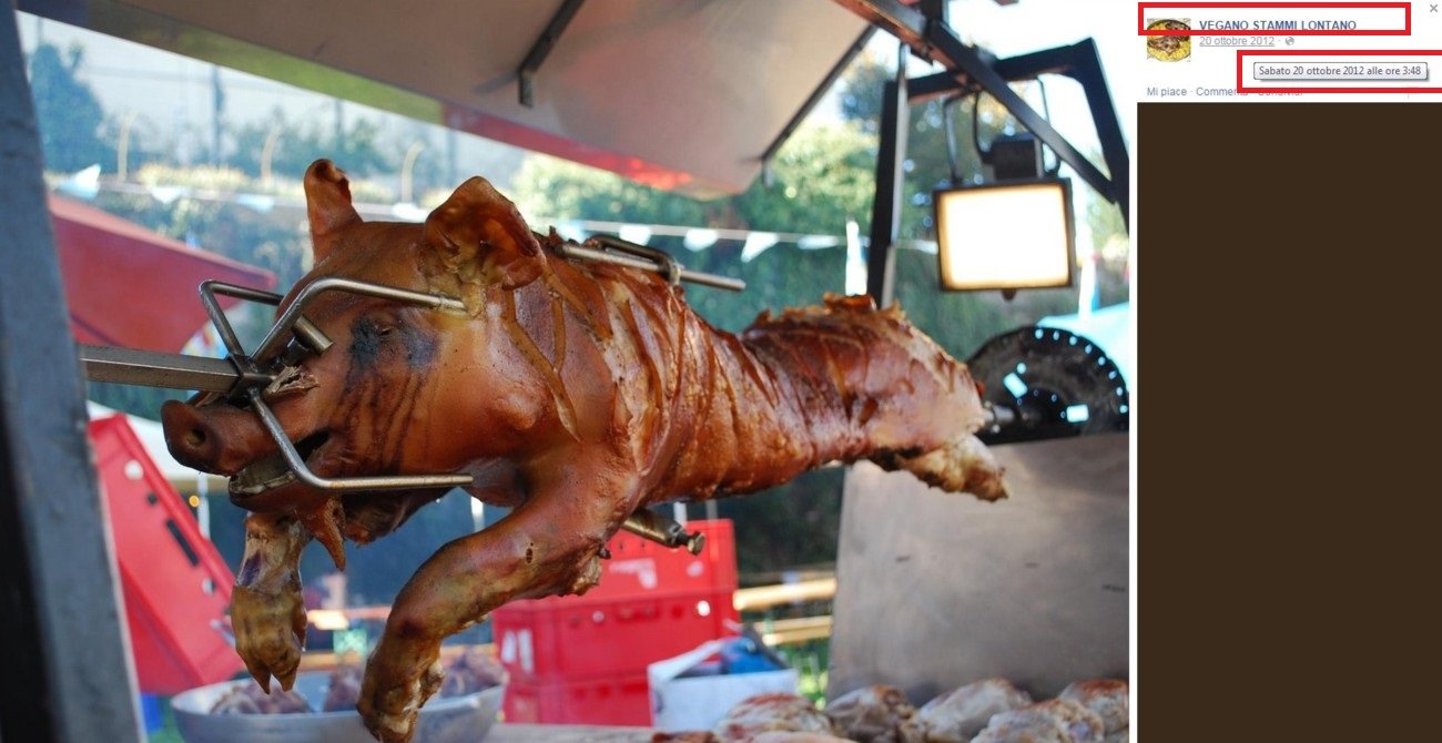 Una volta pubblicate le foto nella sua bacheca ad Andrea Moscati non sembra vero di aver immortalato il povero Maiale. DOPO CINQUE MINUTI ESATTI, ECCO LA STESSA FOTO PUBBLICATA SULLA PAGINA DI VEGANO STAMMI LONTANO – FOTO DI “COPERTINA” DELLA PAGINA PER MOLTO TEMPO.