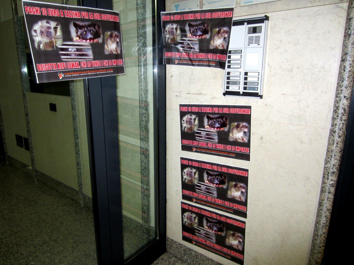 Nella notte tra il 2 e 3 febbraio, militanti del Movimento Centopercentoanimalisti hanno attaccato locandine eloquenti sulle vetrine del Bar Cadò in via Scrovegni a Padova (lo ripetiamo, uno dei principali venditori e importatori del Nord Est) e all’ingresso della sede dell’APPE in via Savelli, sempre a Padova, di cui il titolare del bar è un membro di spicco. Il barista del Cadò faccia un passo indietro, rinunci alla vendita e importazione del caffé Kopi Luwak, in caso contrario le nostre azioni di protesta continueranno.