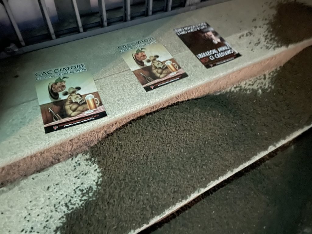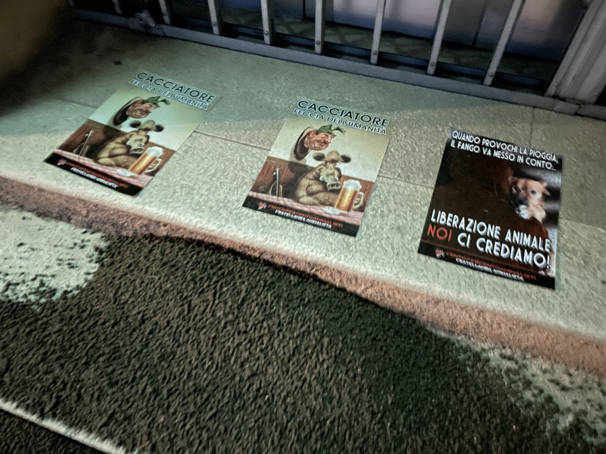 Per far capire che al presidente del parco Pineta (e non solo lui) che gli Animali non sono bersagli per gli assassini legalizzati, e che noi non molleremo le nostre legittime proteste, nella prima serata di mercoledì 19 maggio, alcuni Militanti del Movimento Centopercentoanimalisti hanno versato oltre 30 Kg di letame (puzzolente) davanti all’ingresso della sede del parco Pineta, in via Manzoni, 11 a Castelnuovo Bozzente (Como), inoltre sono stati appiccati manifesti contro i cacciatori e altri di “riflessione”. Fino alla fine Animali liberi!