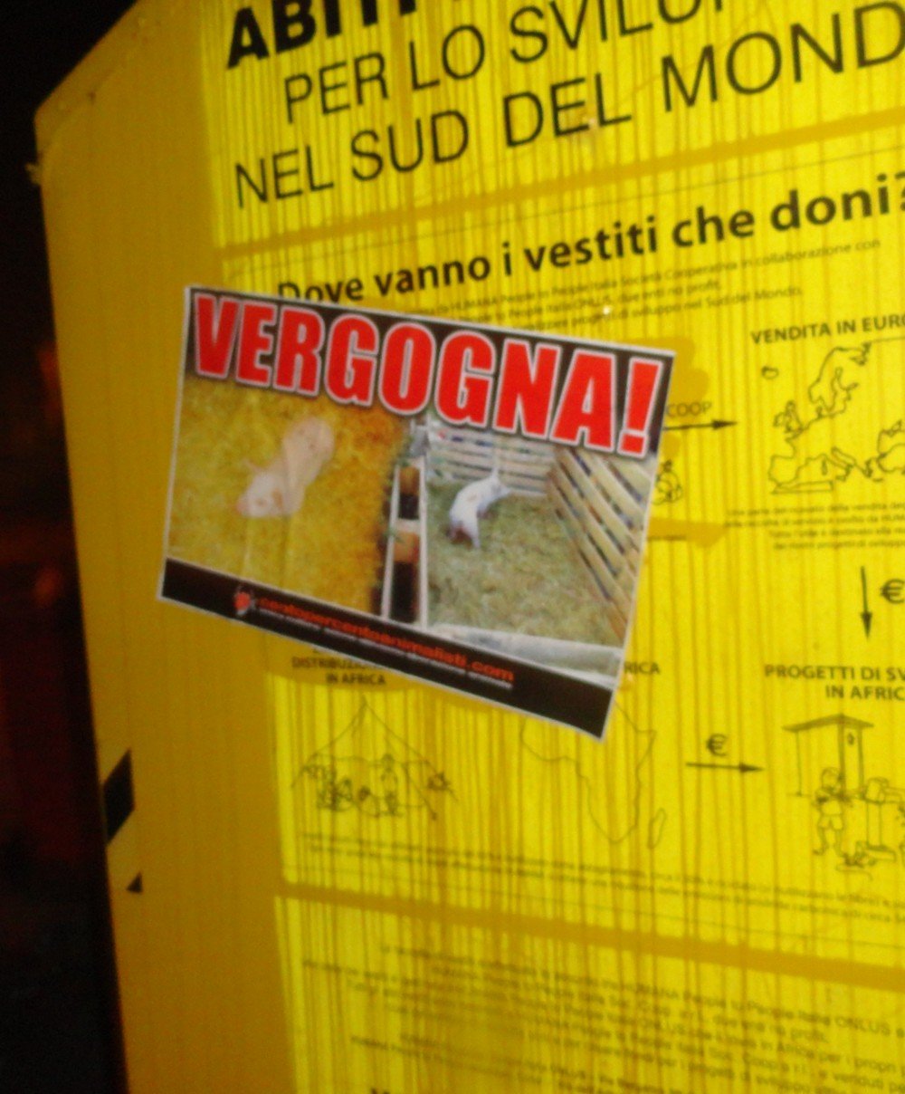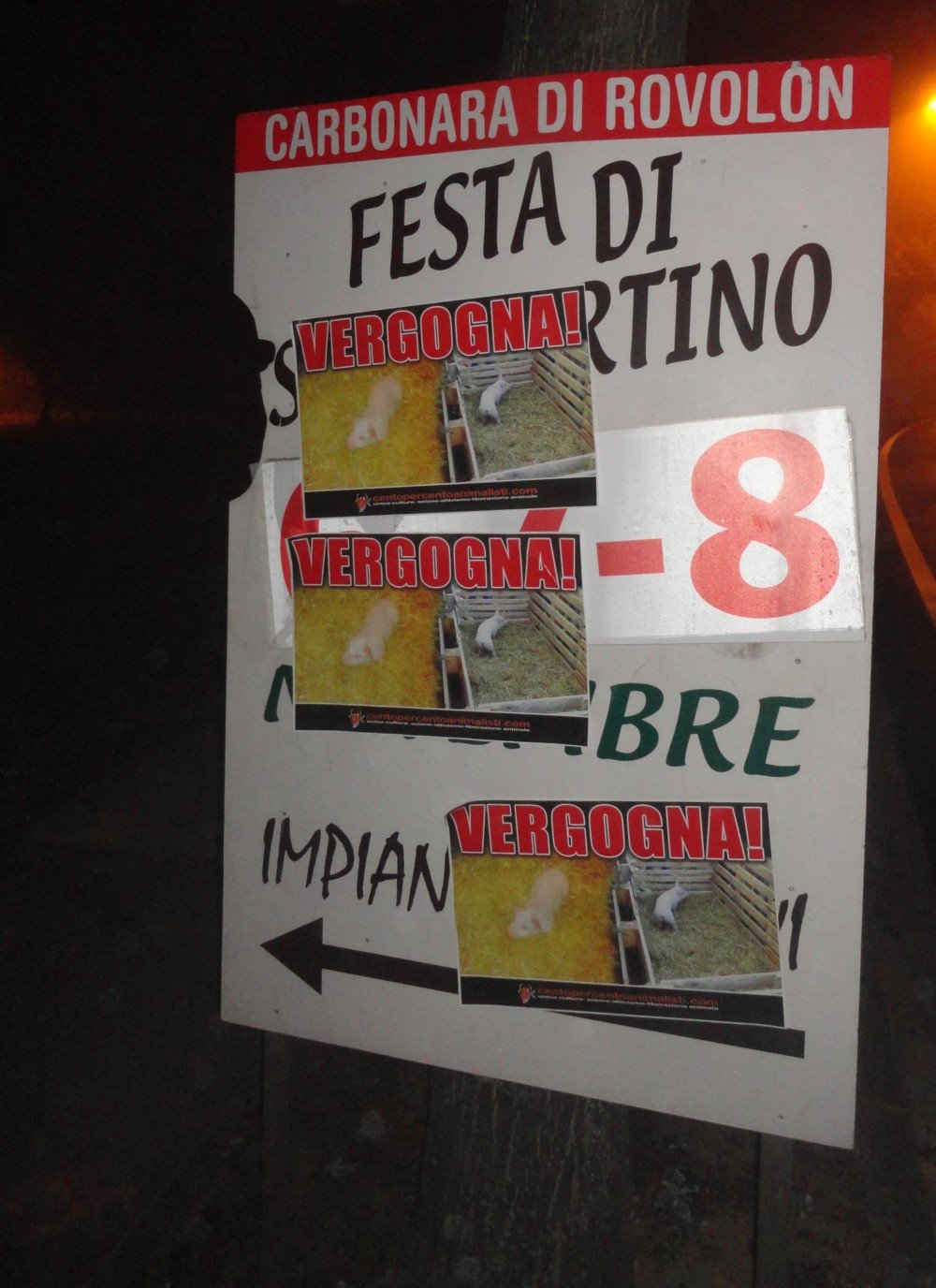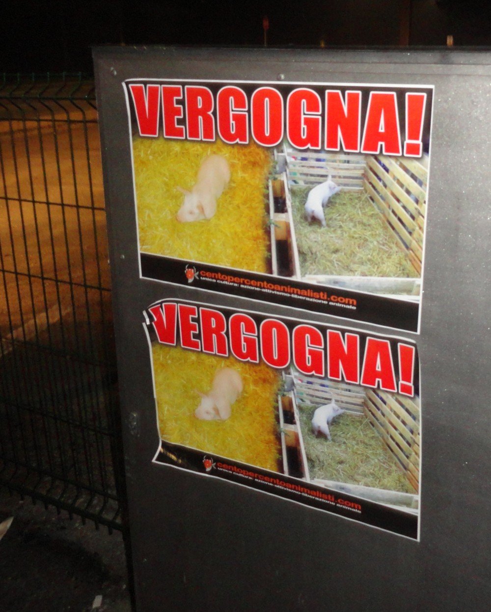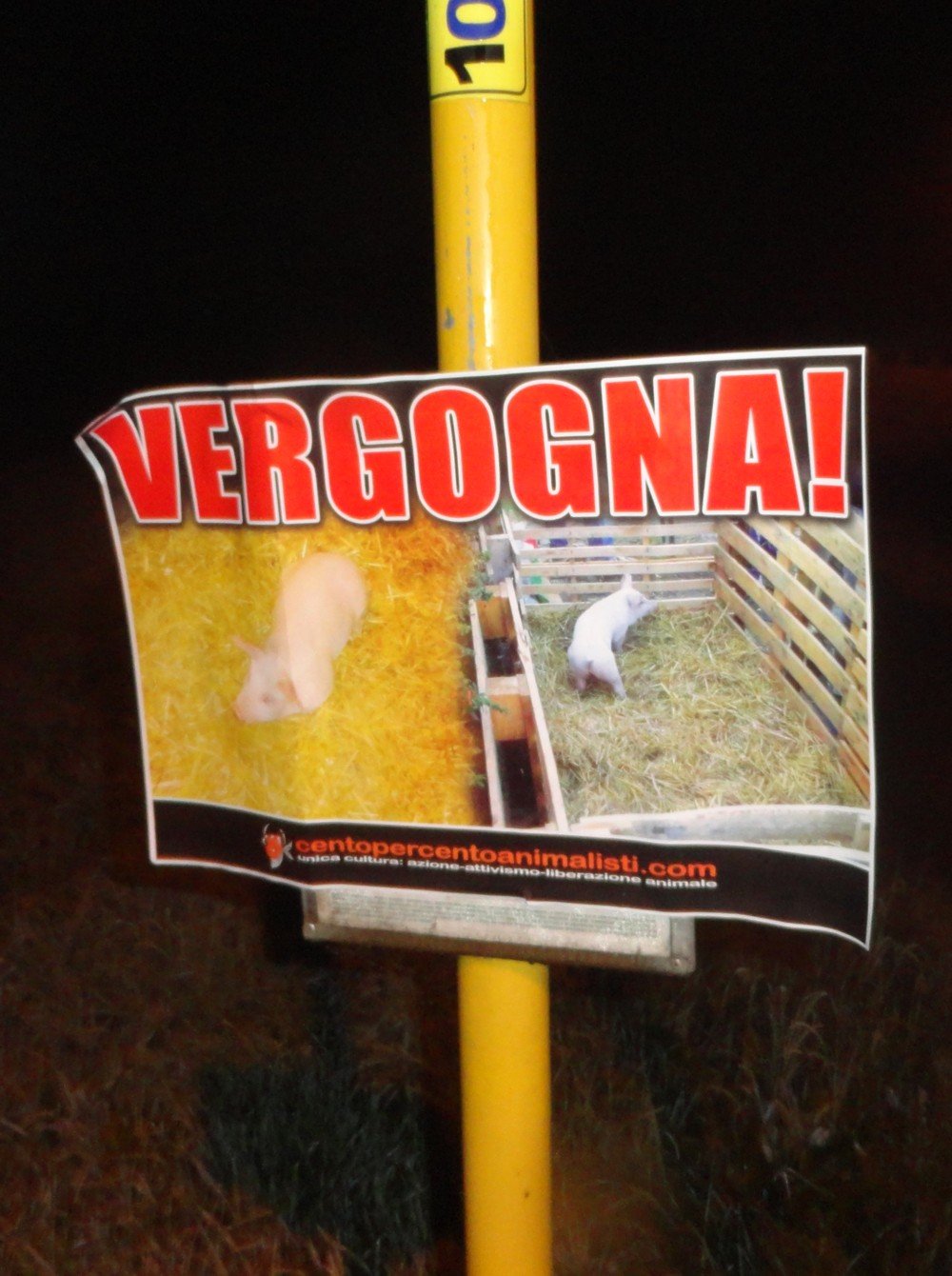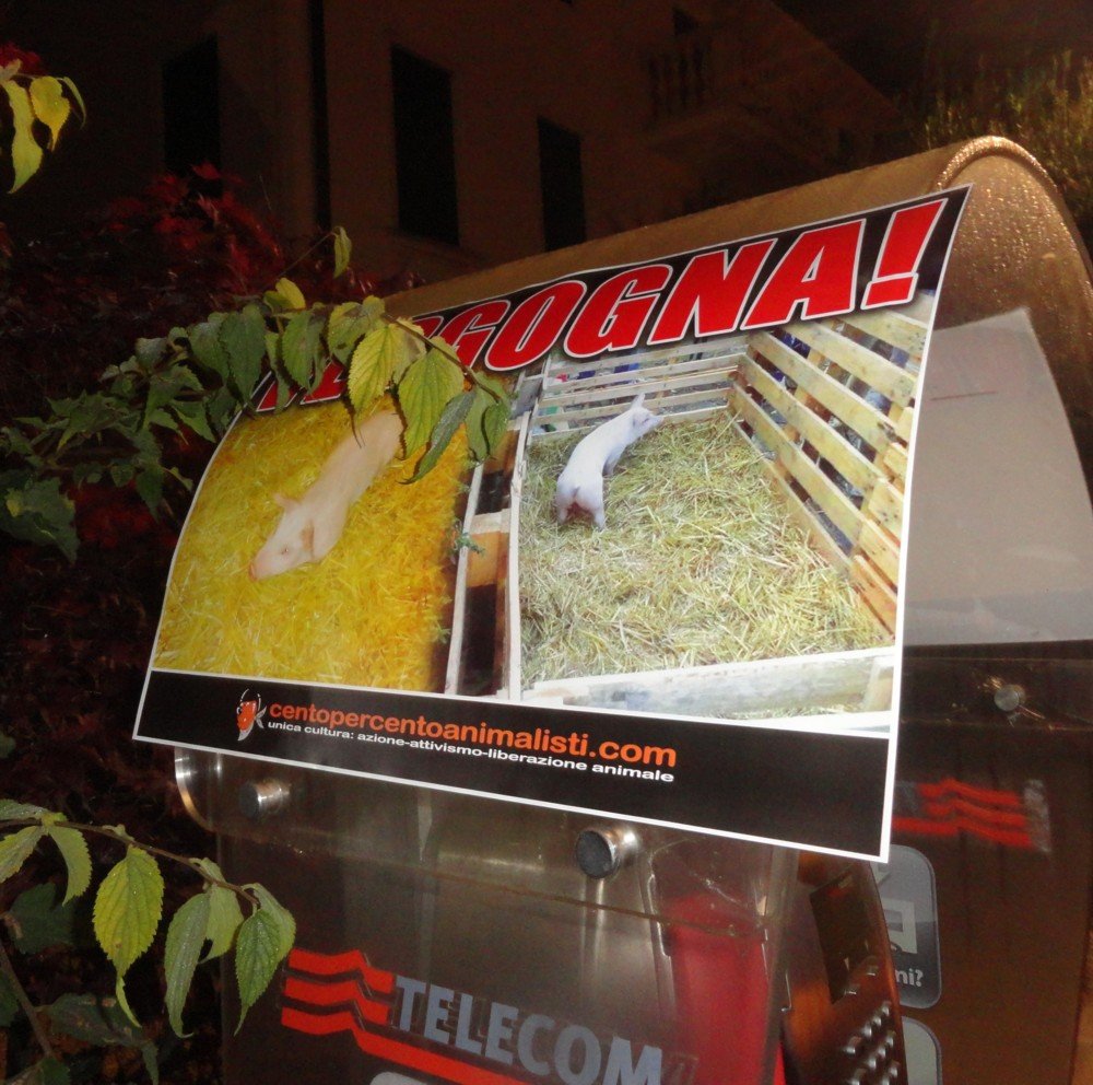 Questo è il messaggio delle locandine adesive che i militanti di CENTOPERCENTOANIMALISTI, nella notte tra il 9 e 10 novembre, hanno affisso in tutto il paese di Carbonera, parrocchia compresa. Esiste un’ordinanza regionale che vieta di mettere Animali in premio nelle sagre, il prete lo sapeva? Il Sindaco lo sapeva? Ci chiediamo inoltre se il povero Maialino avesse tutte le carte in regola.