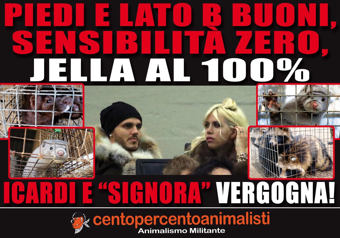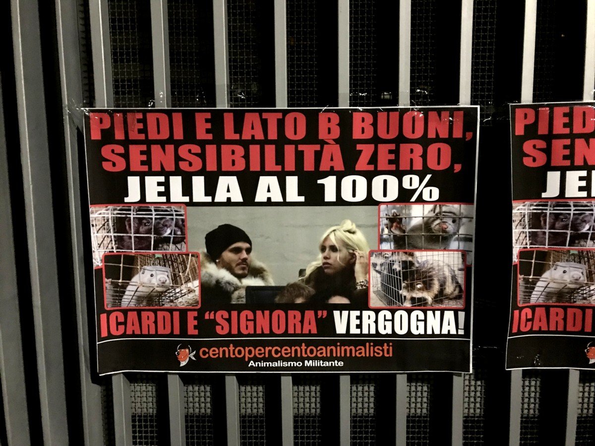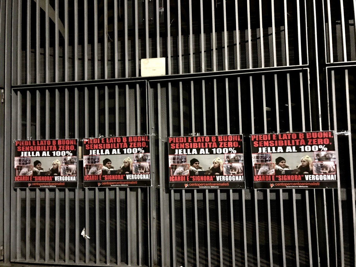 Persone come lui sono, purtroppo, degli opinion maker. Troppa gente è portata ad imitarlo. Gli diciamo dunque: “VERGOGNA!”, con manifesti che i militanti di CENTOPERCENTOANIMALISTI, nella notte tra il 13 e 14 febbraio, hanno affisso su alcuni ingressi dello stadio Meazza a Milano.