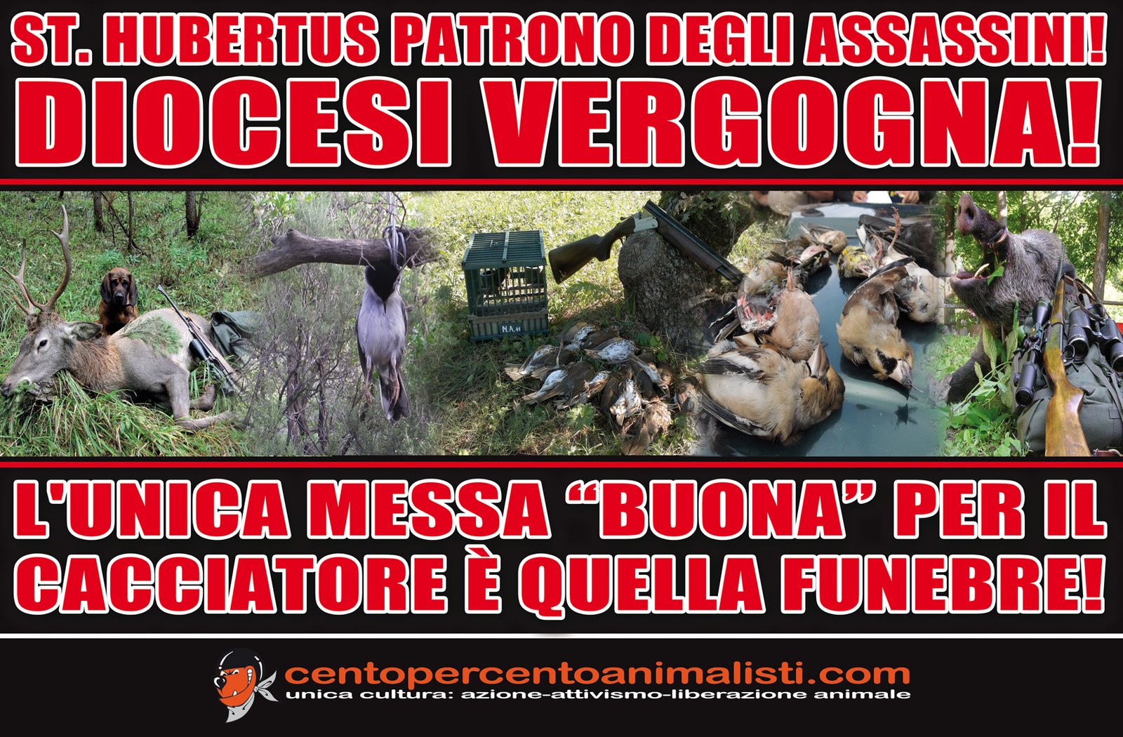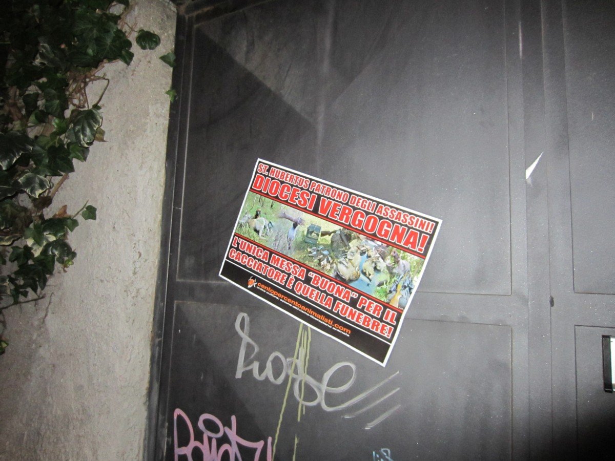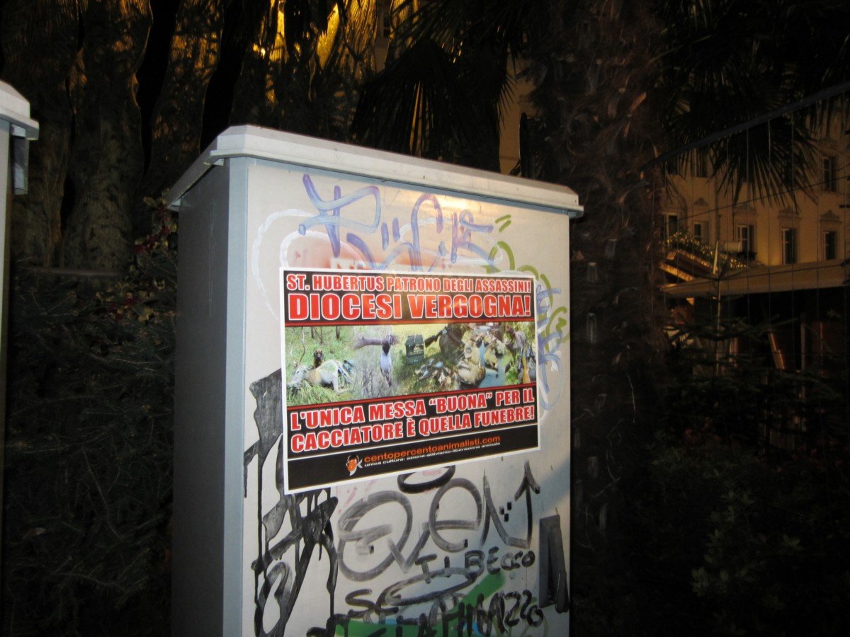 Militanti di CENTOPERCENTOANIMALISTI, nella notte tra il 28 e 29 novembre, hanno affisso sui muri e portoni della Diocesi, del Duomo e delle zone adiacenti a Trento, locandine con un messaggio chiaro: “ST. HUBERTUS PATRONO DEGLI ASSASSINI! DIOCESI VERGOGNA! L’UNICA MESSA “BUONA” PER IL CACCIATORE E’ QUELLA FUNEBRE”. Non sono da escludere altre azioni dirette il 2 dicembre.