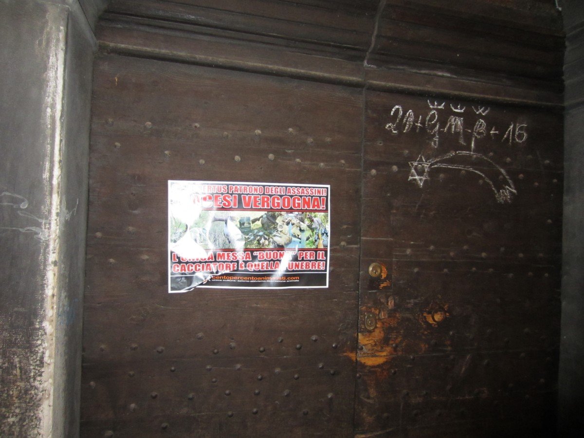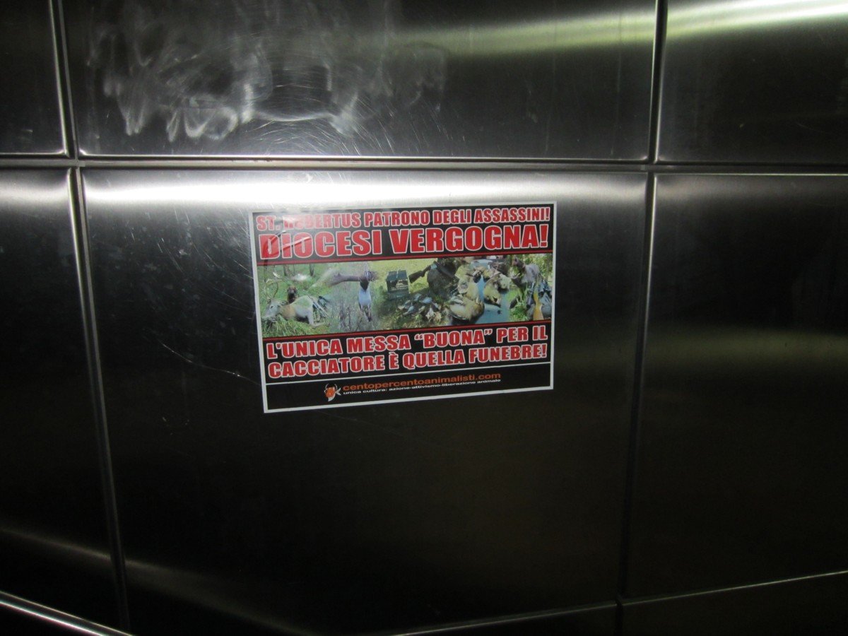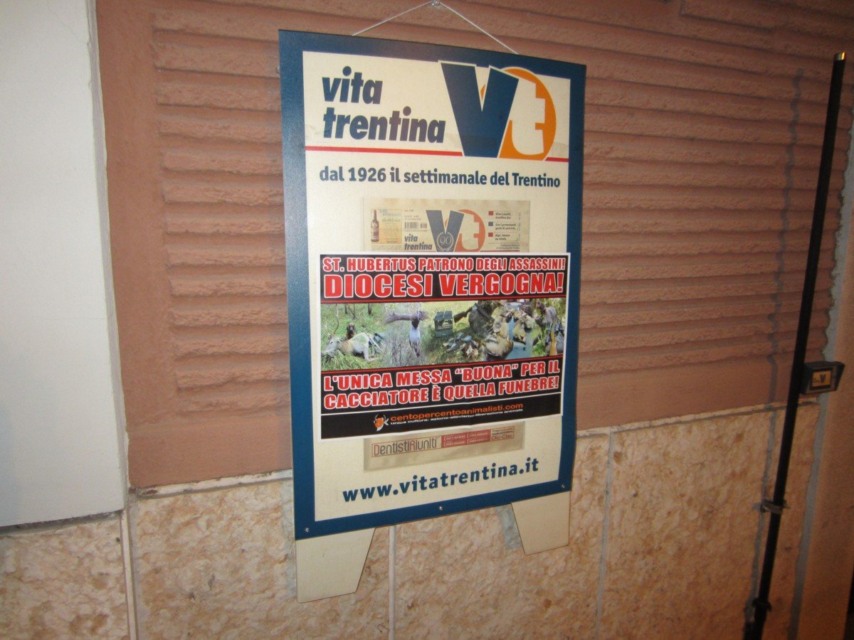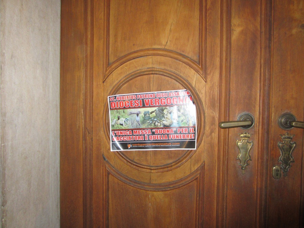 Militanti di CENTOPERCENTOANIMALISTI, nella notte tra il 28 e 29 novembre, hanno affisso sui muri e portoni della Diocesi, del Duomo e delle zone adiacenti a Trento, locandine con un messaggio chiaro: “ST. HUBERTUS PATRONO DEGLI ASSASSINI! DIOCESI VERGOGNA! L’UNICA MESSA “BUONA” PER IL CACCIATORE E’ QUELLA FUNEBRE”. Non sono da escludere altre azioni dirette il 2 dicembre.