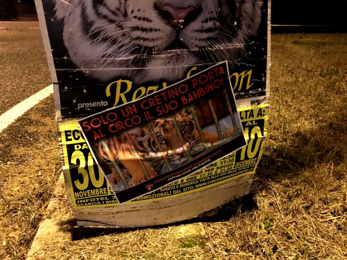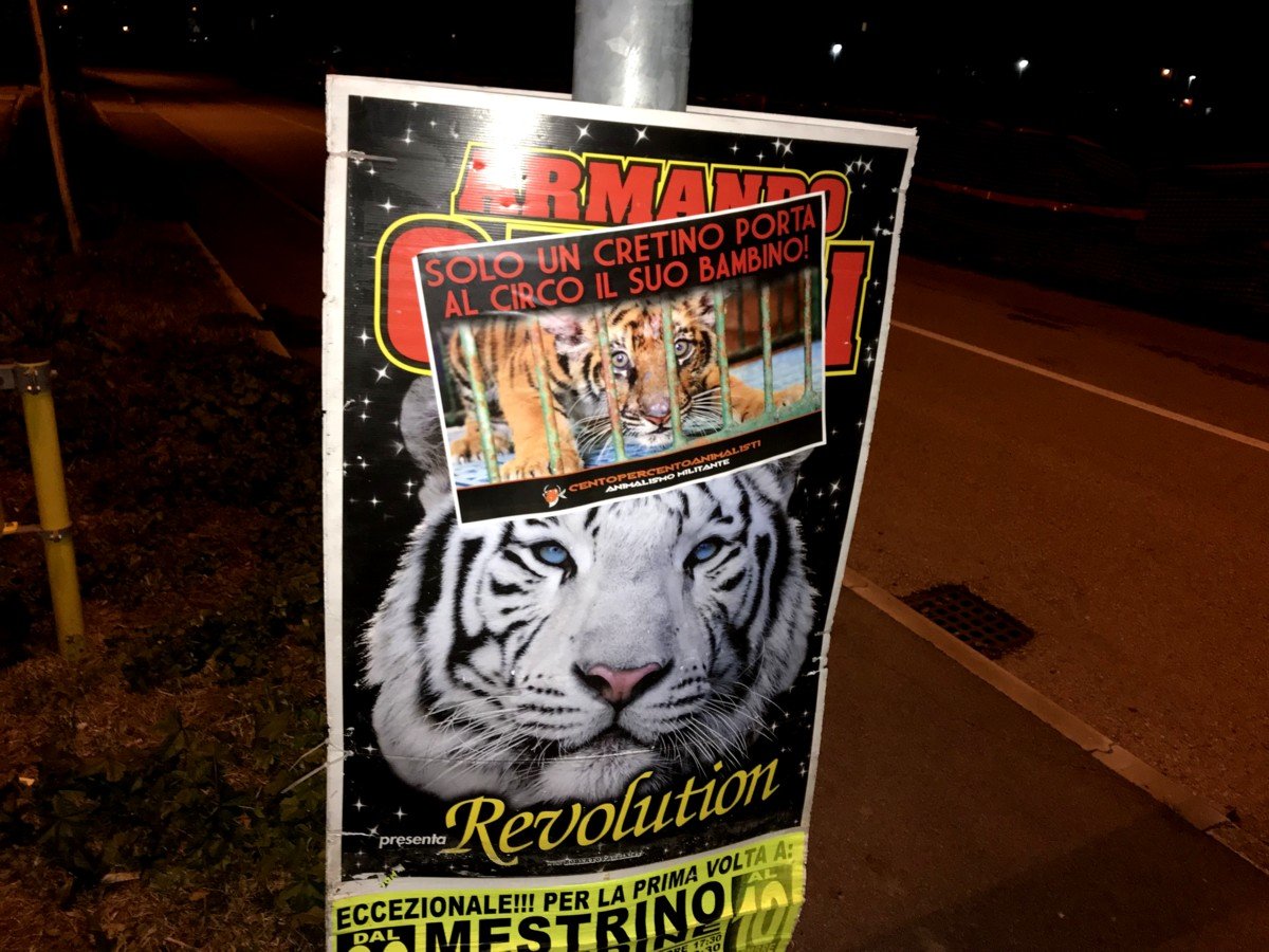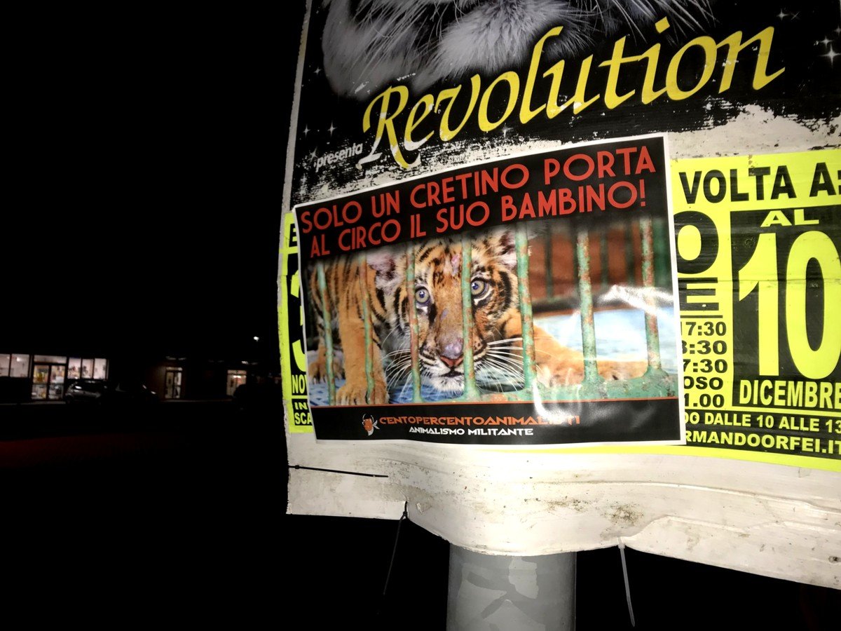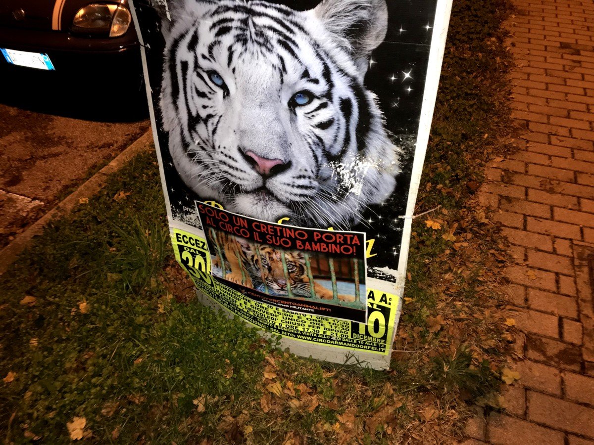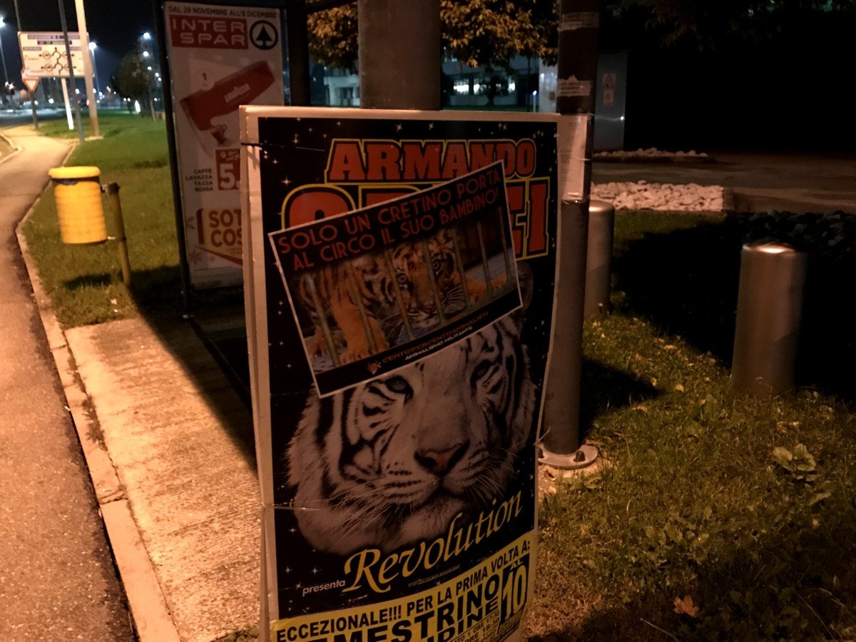 Nostri Militanti, nella notte tra il 27 e 28 novembre, hanno affisso locandine adesive nella zona, municipio compreso, rivolte proprio ai possibili spettatori complici delle sofferenze degli Animali e coperto gran parte dei cartelloni (abusivi?) circensi a Mestrino.