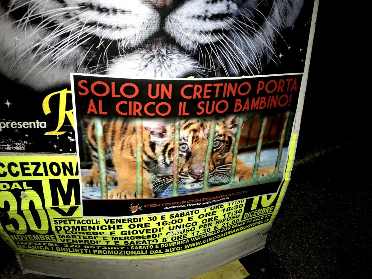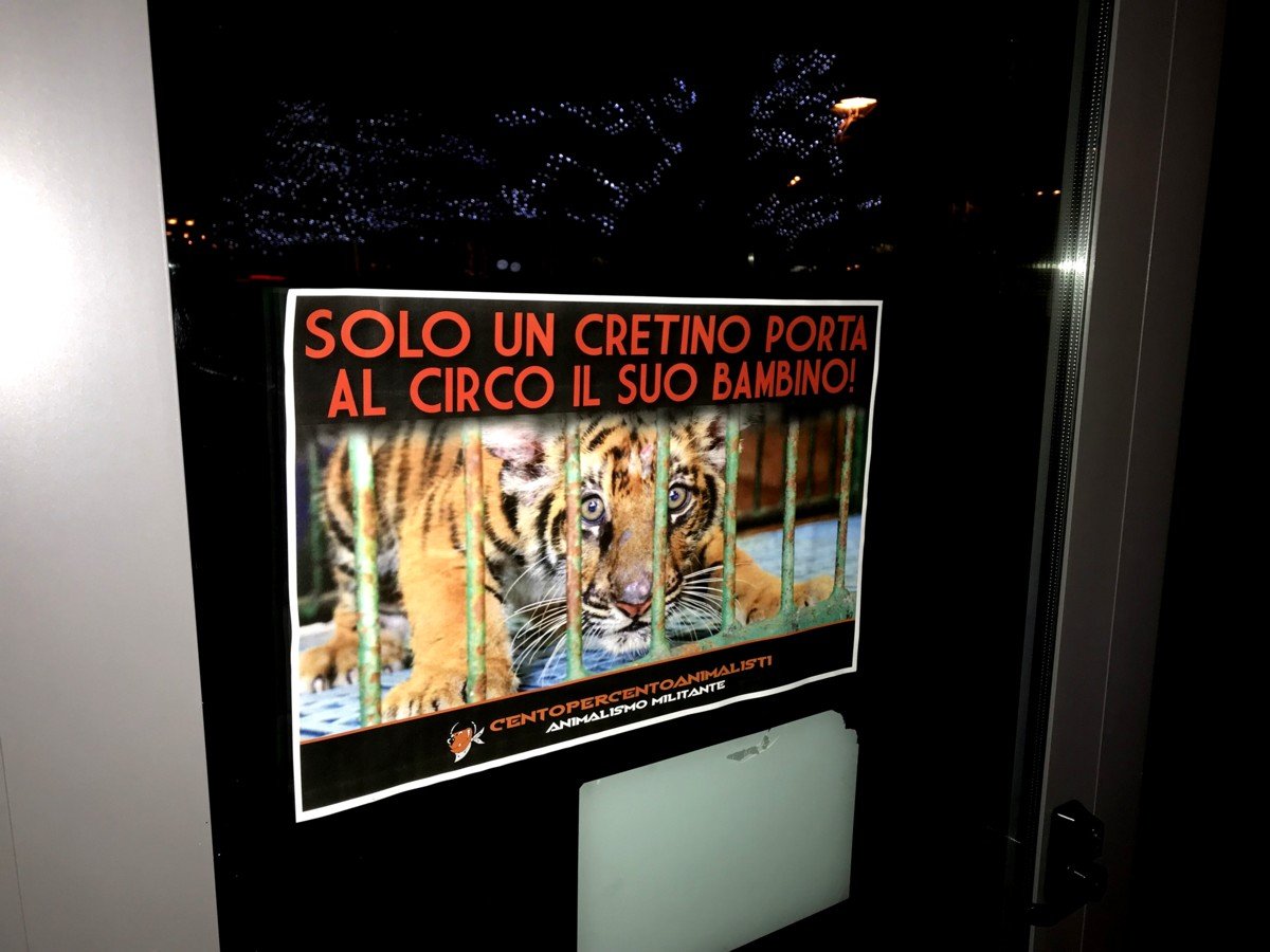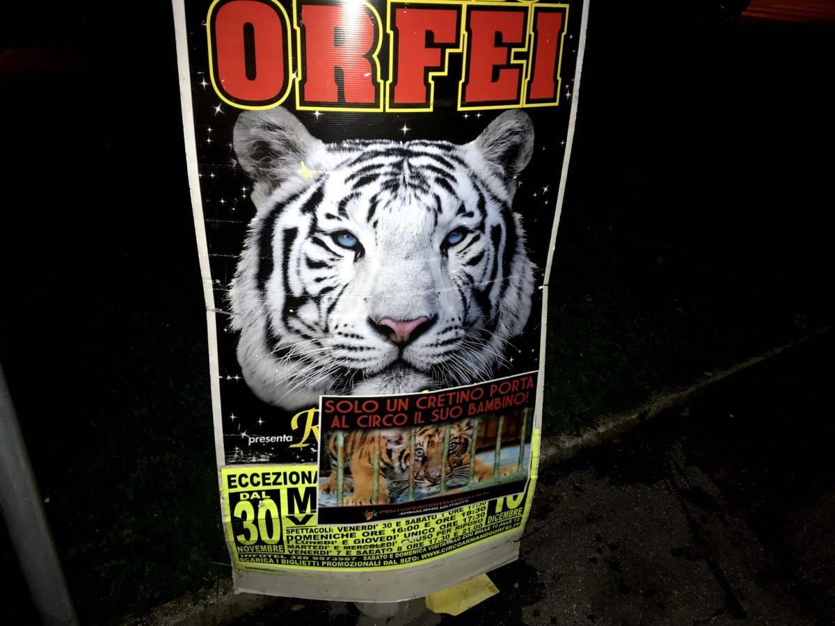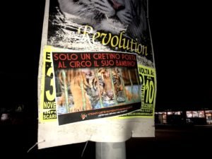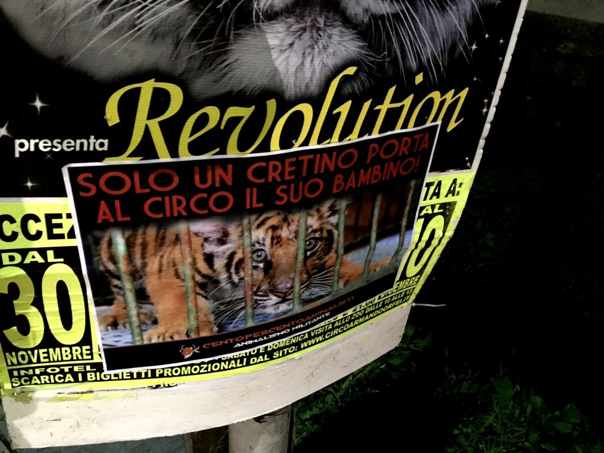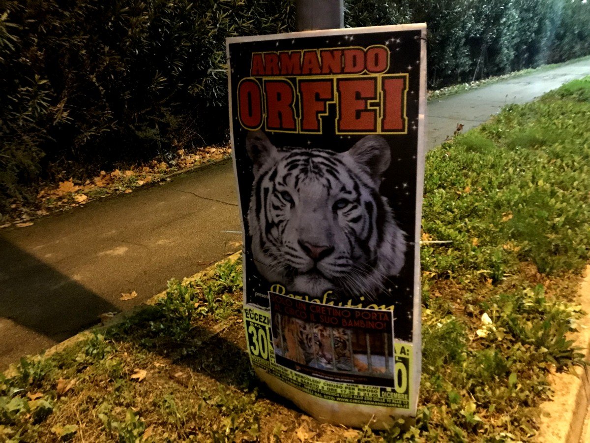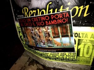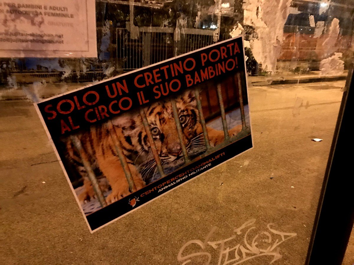 Nostri Militanti, nella notte tra il 27 e 28 novembre, hanno affisso locandine adesive nella zona, municipio compreso, rivolte proprio ai possibili spettatori complici delle sofferenze degli Animali e coperto gran parte dei cartelloni (abusivi?) circensi a Mestrino.