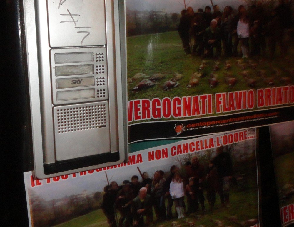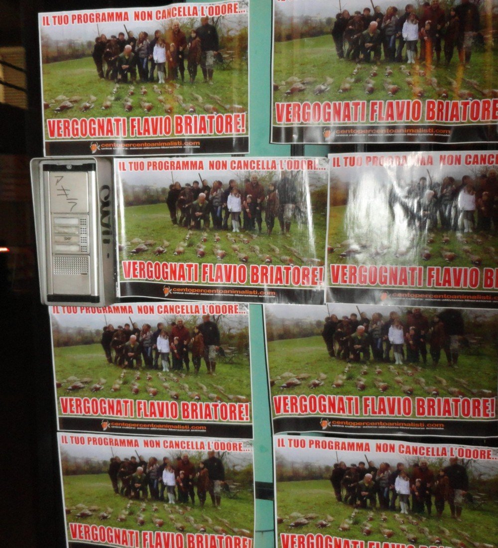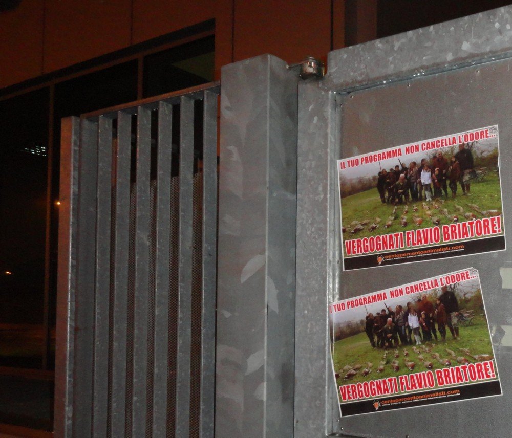 Nella notte tra il 2 e 3 gennaio militanti di CENTOPERCENTOANIMALISTI lo hanno “salutato” affiggendo numerose locandine in via Monte Penice a Milano, quartier generale di SKY (e nella vecchia sede di via Piranesi) che lo riprendono con i Fagiani massacrati, dove si legge chiaro il messaggio che merita: Flavio Briatore vergogna!