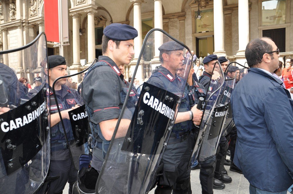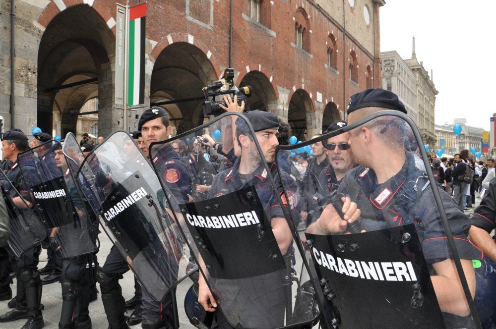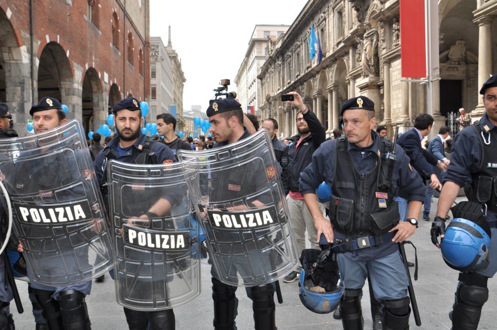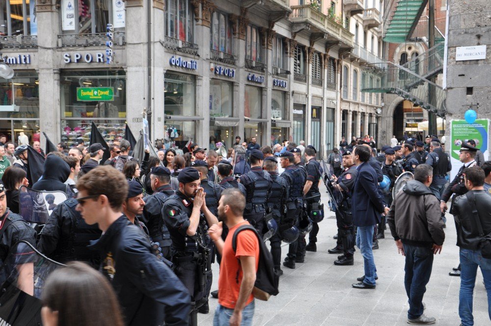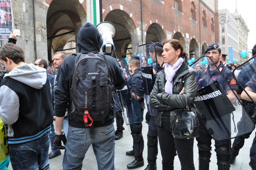 In mezzo, un cordone di Carabinieri e reparto mobile della celere in assetto antisommossa e parecchi agenti della Digos.