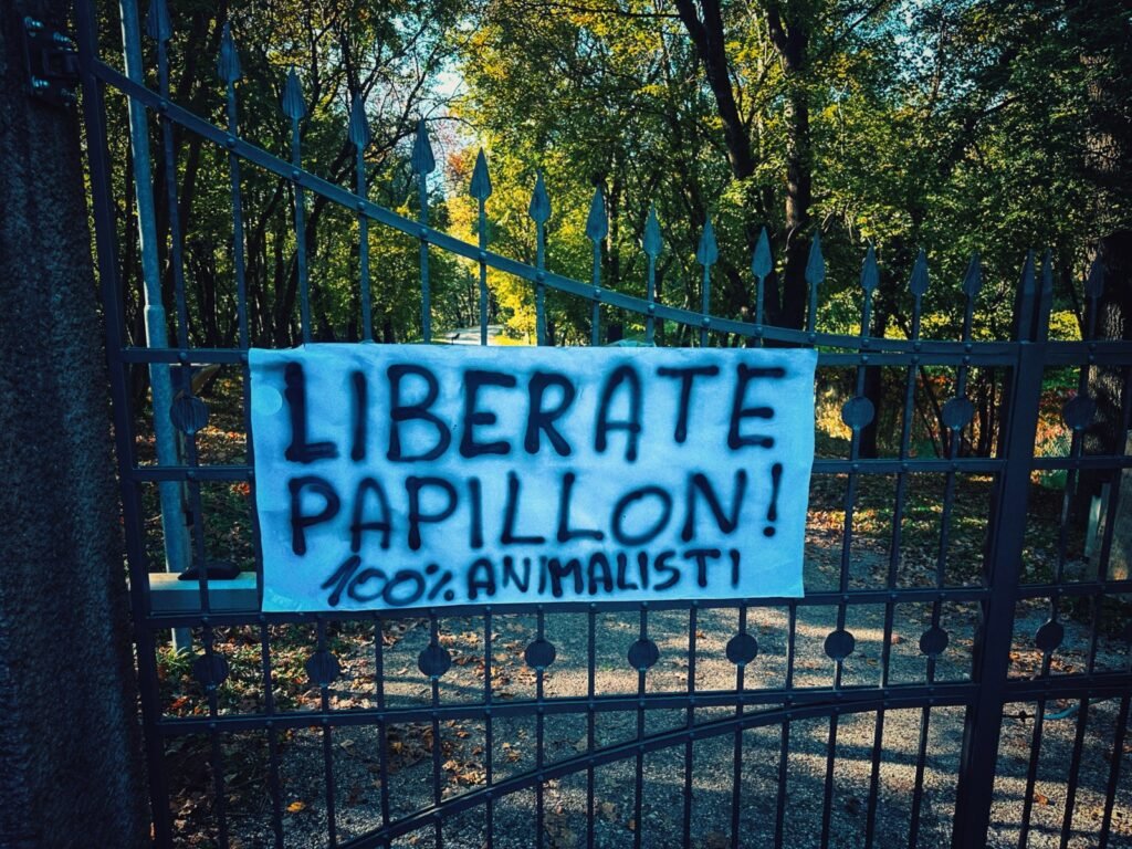 Successivamente, si sono recati in piazza Dante e poi al Casteller dove hanno affisso uno striscione per la liberazione di M49, l’orso Papillon.