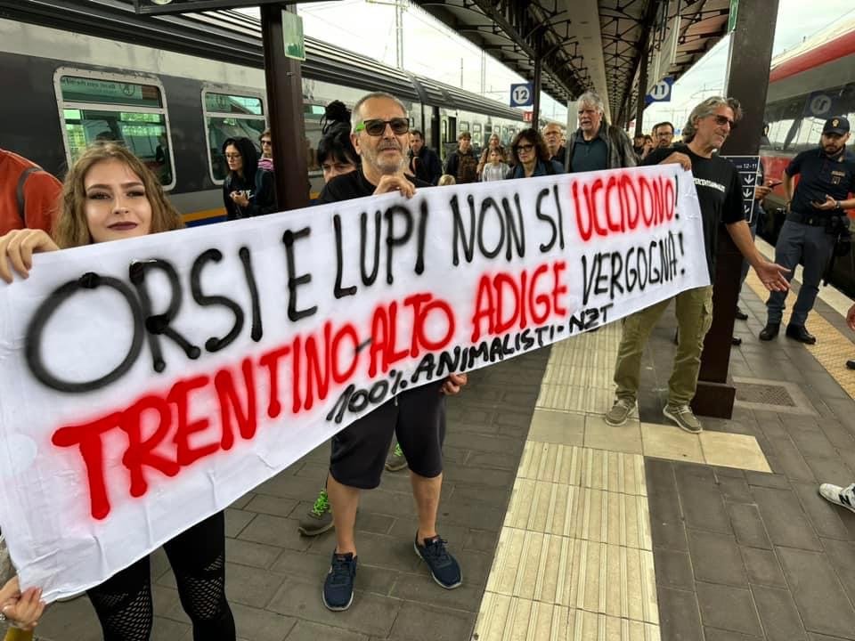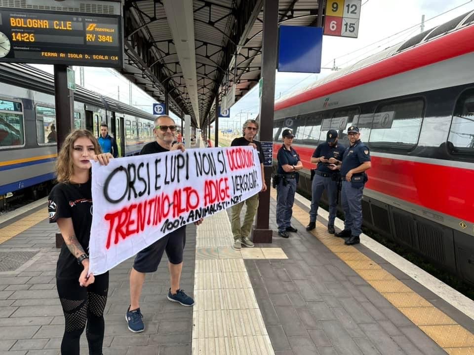 Militanti del Movimento Centopercentoanimalisti, martedì 29 agosto, hanno tentato di bloccare alla stazione porta nuova di Verona, il treno frecciarossa 8509 proveniente da Bologna in direzione Trento, Bolzano. La Polizia è riuscita a bloccare i manifestanti mentre stavano per occupare i binari. Intervenuti successivamente Agenti della DIGOS di Verona che hanno identificato tutti i Militanti. Le persone che hanno assistito al blitz hanno apprezzato la protesta, conferma che la sorte dei poveri Orsi e Lupi coinvolge non solo gli Animalisti o amanti degli Animali in genere.
