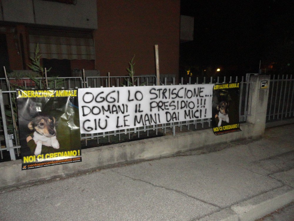 CENTOPERCENTOANIMALISTI difende gli Animali e chi si prende cura di loro. Nostri militanti, nella notte tra il 9 e 10 luglio, hanno affisso al condominio uno striscione di “monito” sul cancello del condominio: le vessazioni a danno dei Gatti e della Gattara devono cessare subito. In caso contrario, la prossima mossa sarà un presidio sotto le finestre dei responsabili.