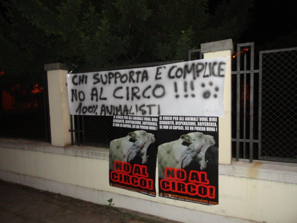 Nella notte tra il 26 e il 27 giugno, militanti di CENTOPERCENTOANIMALISTI hanno affisso sul cancello del municipio di Noale, manifesti contro il circo molto “espliciti” e uno striscione diretto alla giunta comunale.