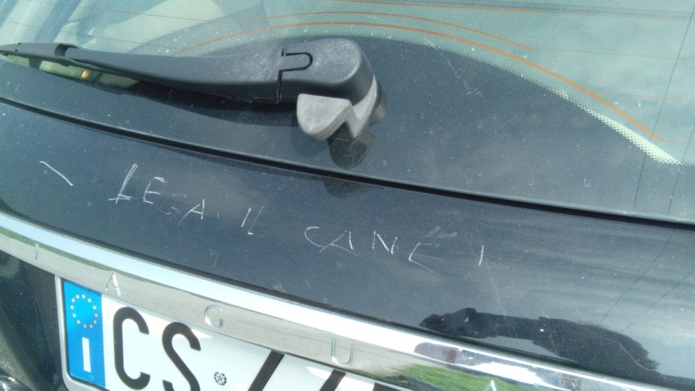 Quando poi è tornato all’auto, una Jaguar, questi ha trovato due pneumatici forati e, incisa sul portellone posteriore, la scritta “LEGA IL CANE” (!).