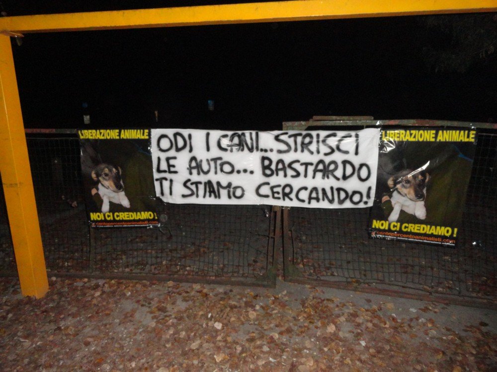 Nella notte tra il 30 settembre e il 1 ottobre, i nostri militanti hanno affisso manifesti di liberazione animale e uno striscione di “avvertimento” sui cancelli del parco di Roncajette diretti al vigliacco del parco con scritto “Odi i Cani… strisci le auto…bastardo ti stiamo cercando” … la zona ora è monitorata.