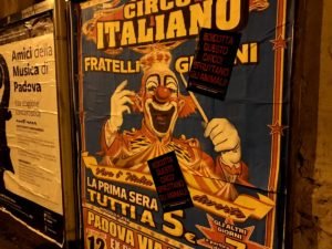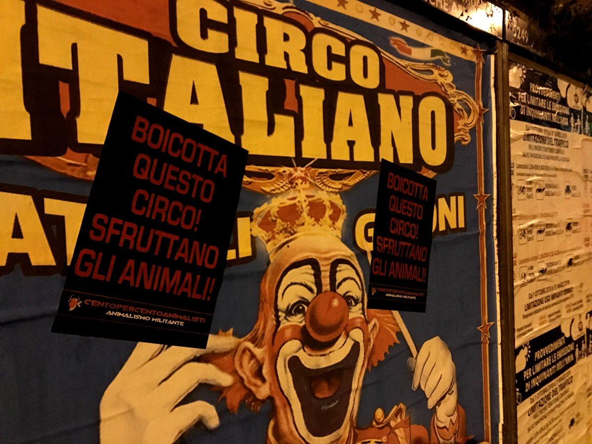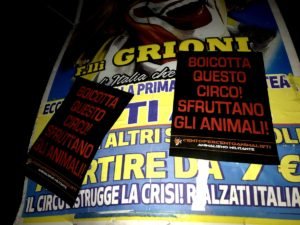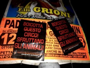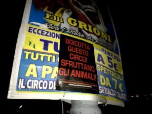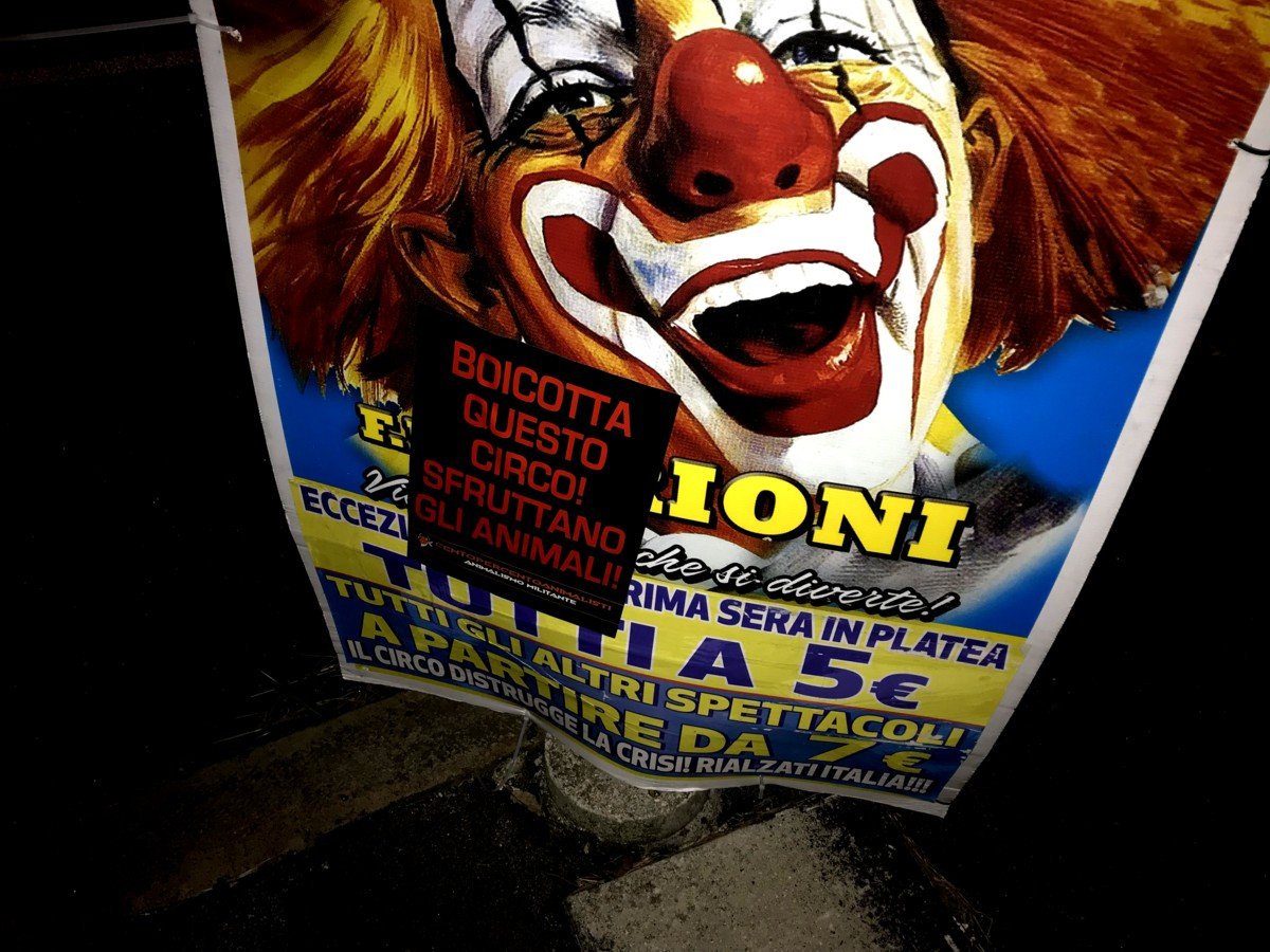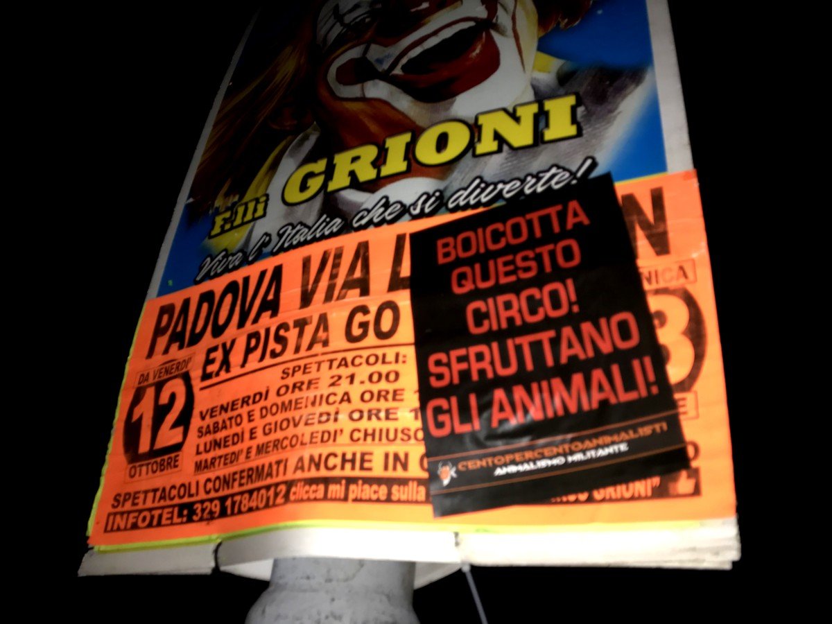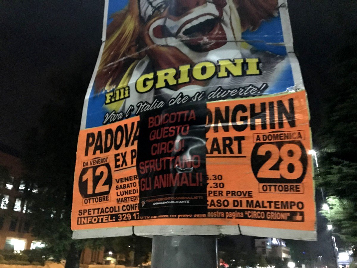 I nostri militanti, nella notte tra il 16 e 17 ottobre, hanno “oscurato” e “avvisato” i Padovani in buona fede, appiccicando locandine adesive sui cartelloni pubblicitari (pochi) dei circensi. Che i circensi a Padova abbiamo adottato questa strategia, la consideriamo una vittoria, i pochi cartelloni appesi (forse abusivi) dimostrano che conoscono bene le azioni “tabula rasa” dei nostri Militanti nella città del Santo. la famiglia Grioni faccia esibire i suoi bravissimi artisti, bravi davvero, ma tolga definitivamente dal loro spettacolo gli Animali.