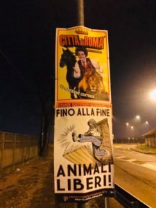 Nella notte tra il 18 e 19 febbraio, Militanti di Centopercentoanimalisti hanno “oscurato” alcuni manifesti circensi affissi a Saronno, nella speranza che i cittadini, e non solo loro, riflettano! Una gabbia d’oro è sempre una gabbia!