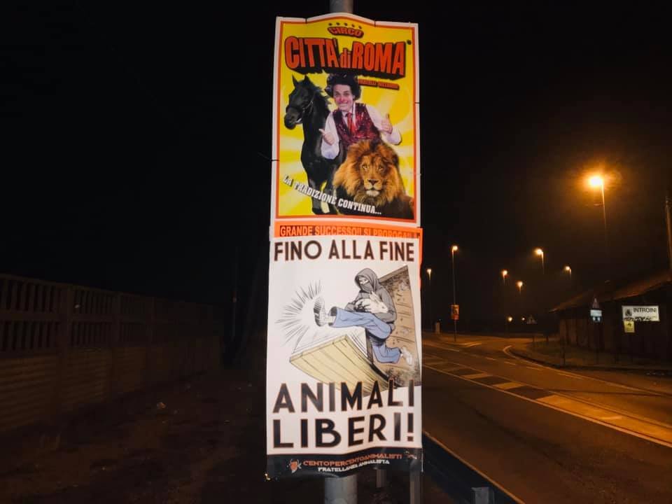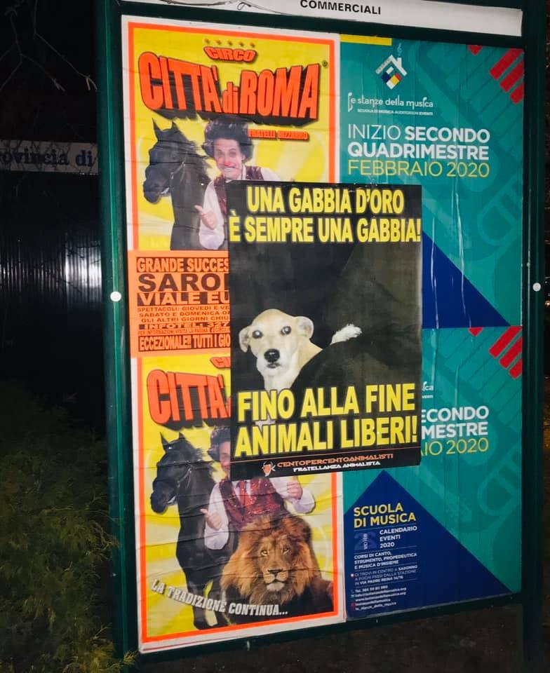 Nella notte tra il 18 e 19 febbraio, Militanti di Centopercentoanimalisti hanno “oscurato” alcuni manifesti circensi affissi a Saronno, nella speranza che i cittadini, e non solo loro, riflettano! Una gabbia d’oro è sempre una gabbia!