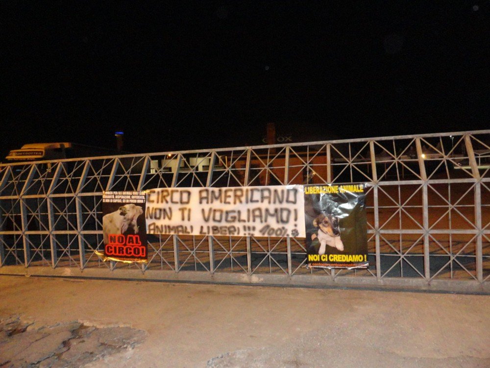 Nella notte tra l’11 e il 12 novembre militanti di CENTOPERCENTOANIMALISTI hanno affisso sul cancello d’entrata dell’ex foro boario di Corso Australia a Padova, manifesti di liberazione animale, manifesti contro il circo e uno striscione di “non benvenuto” ai circensi..