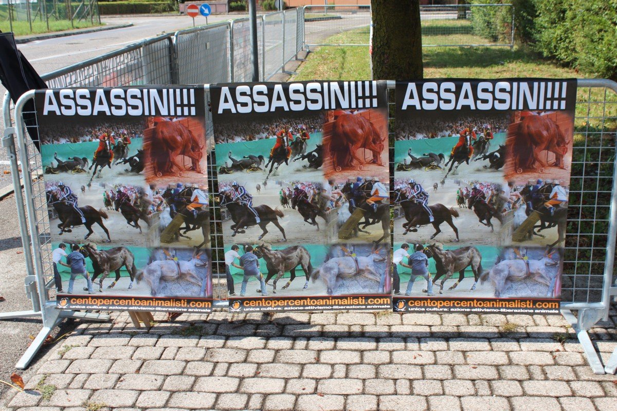 Domenica 6 agosto Militanti del Movimento Centopercentoanimalisti erano presenti a Feltre (Belluno) contro il palio “storico”, come ogni anno da quando nell’edizione del 2006, due Cavalli sono morti a causa dell’incoscienza e incapacità degli organizzatori.