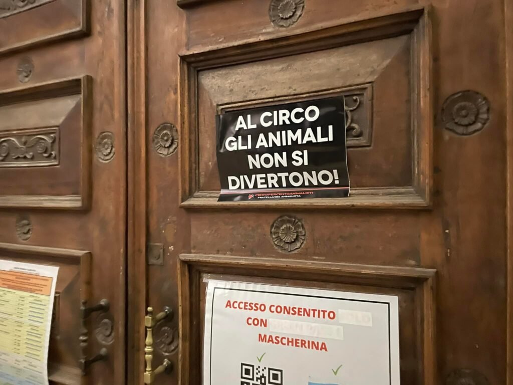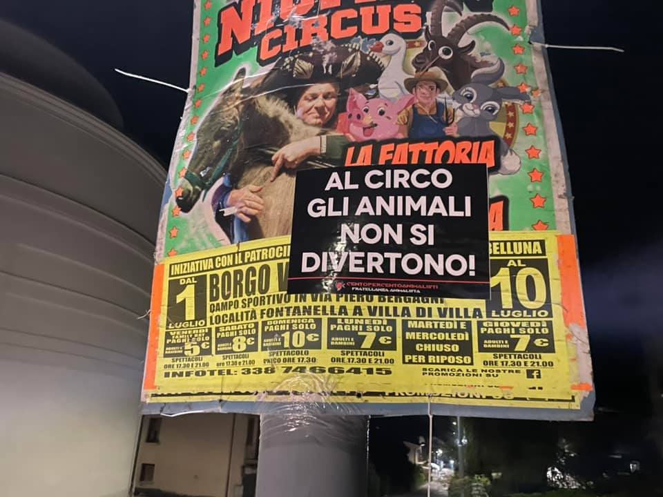 Per far capire al sindaco e la sua giunta che loro iniziativa è stata a dir poco fuori dal tempo ed imbarazzante (siamo gentili), nella serata del 26 giugno, Militanti di Centopercentoanimalisti hanno affisso locandine adesive nel paese, all’ingresso del municipio ed “oscurato” alcuni cartelloni circensi, con scritto: al circo gli Animali non si divertono!