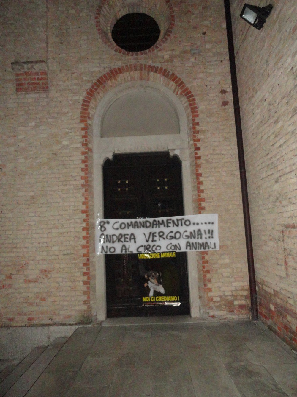 Nella notte tra il 26 e 27 marzo, militanti di Centopercentoanimalisti hanno affisso su una delle porte d’entrata del Santuario della Madonne delle grazie a Pordenone un manifesto di liberazione animale e uno striscione diretto a frate Andrea per rinfrescargli il suo credo, nel caso si fosse dimenticato l’ottavo comandamento, sostenere che gli animali al circo stanno bene è falsa testimonianza!