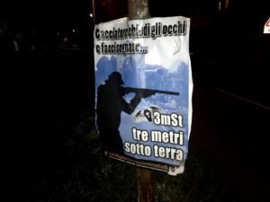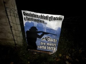 Militanti di CENTOPERCENTOANIMALISTI, nella notte tra il 30 e 31 ottobre, hanno tappezzato la zona dove i cacciatori infastidiscono gli indifesi cittadini con manifesti ironici, sono previste ronde nelle prossime settimane.