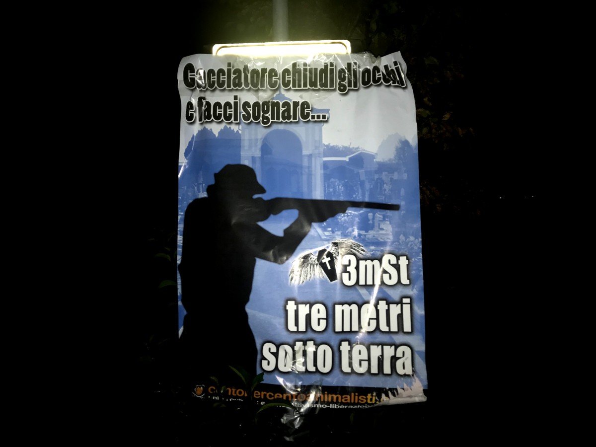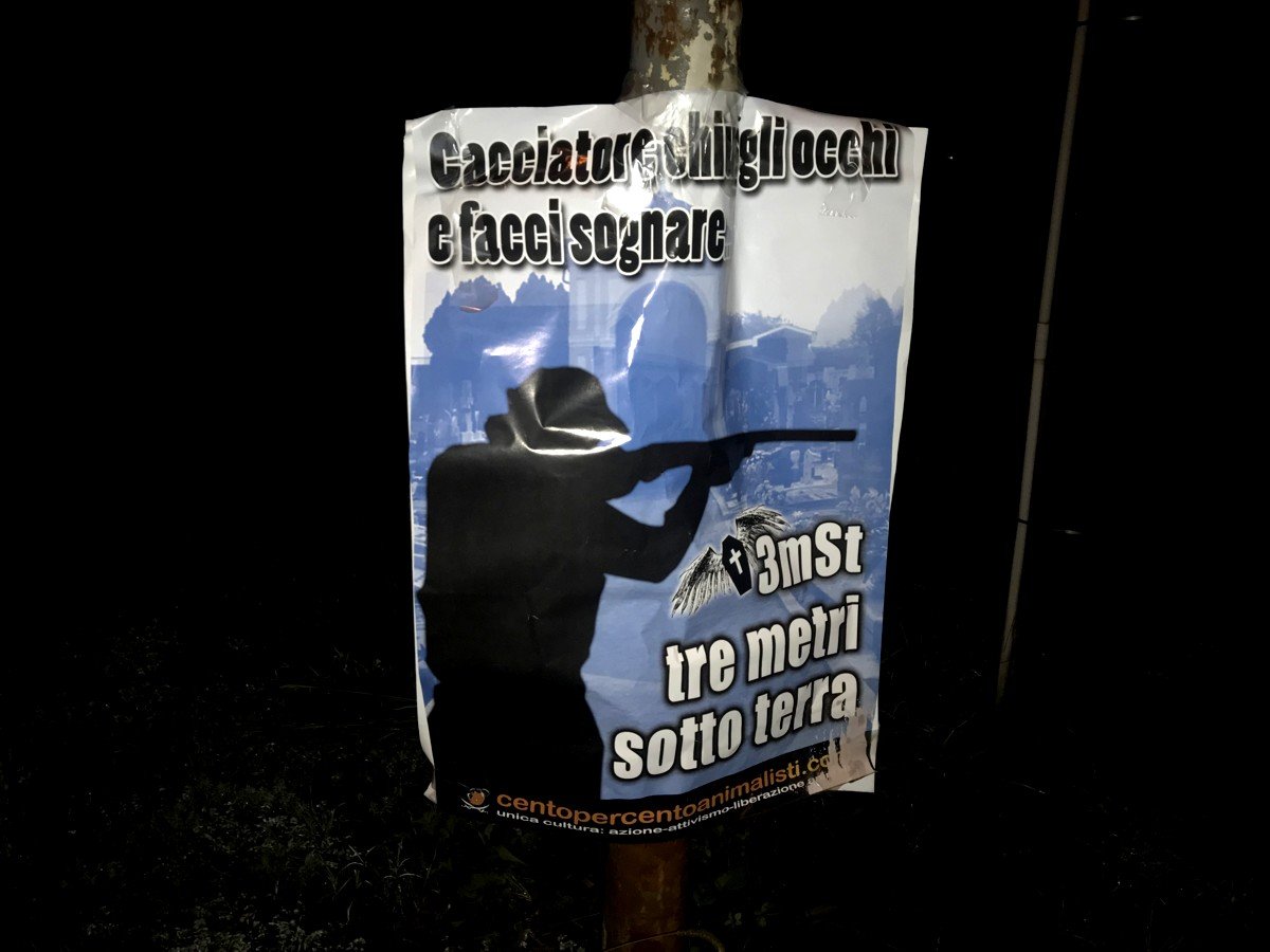 Militanti di CENTOPERCENTOANIMALISTI, nella notte tra il 30 e 31 ottobre, hanno tappezzato la zona dove i cacciatori infastidiscono gli indifesi cittadini con manifesti ironici, sono previste ronde nelle prossime settimane.