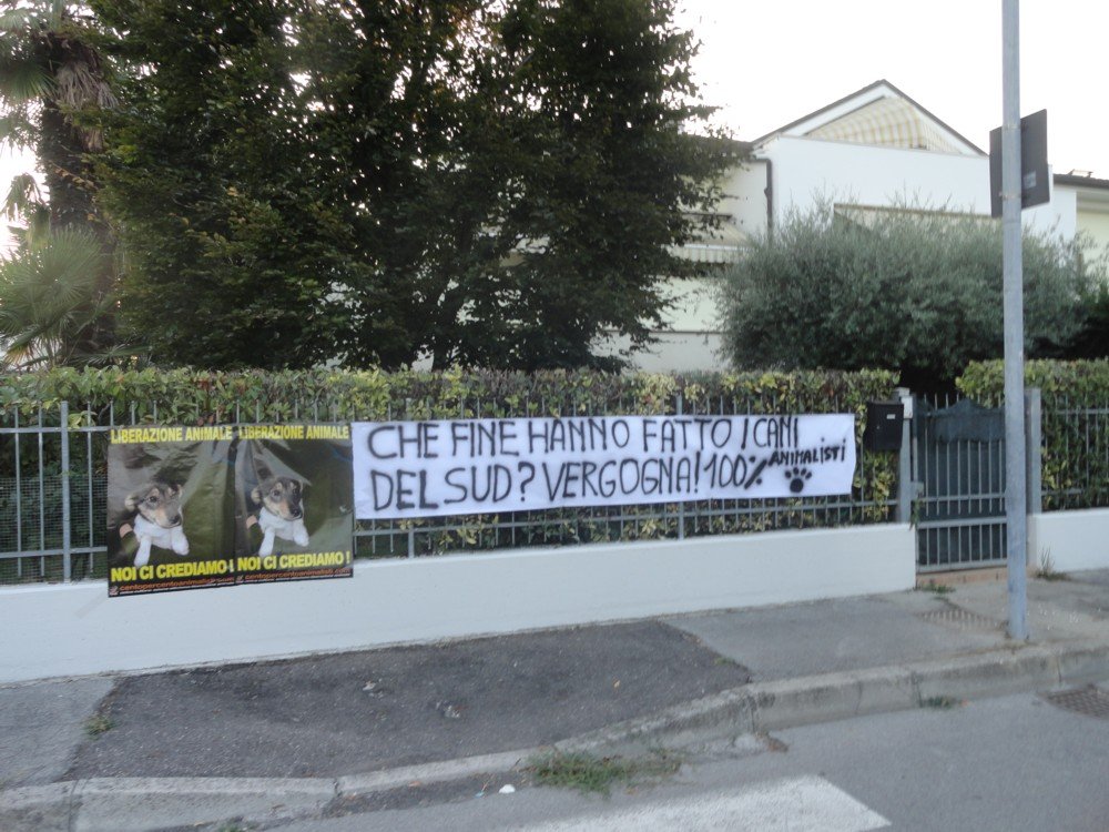 La Gottardo ha aperto un canile ABUSIVO in provincia di Palermo, e la Reato ne ha uno ugualmente ABUSIVO vicino ad Adria. Sono i due terminal della tratta dei Cani? Alla recinzione della casa di Abano i militanti hanno affisso uno striscione in cui si chiede: “Che fine hanno fatto i Cani del Sud?”.