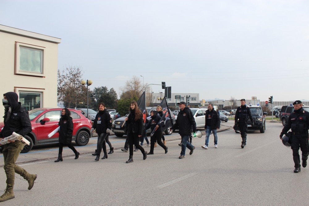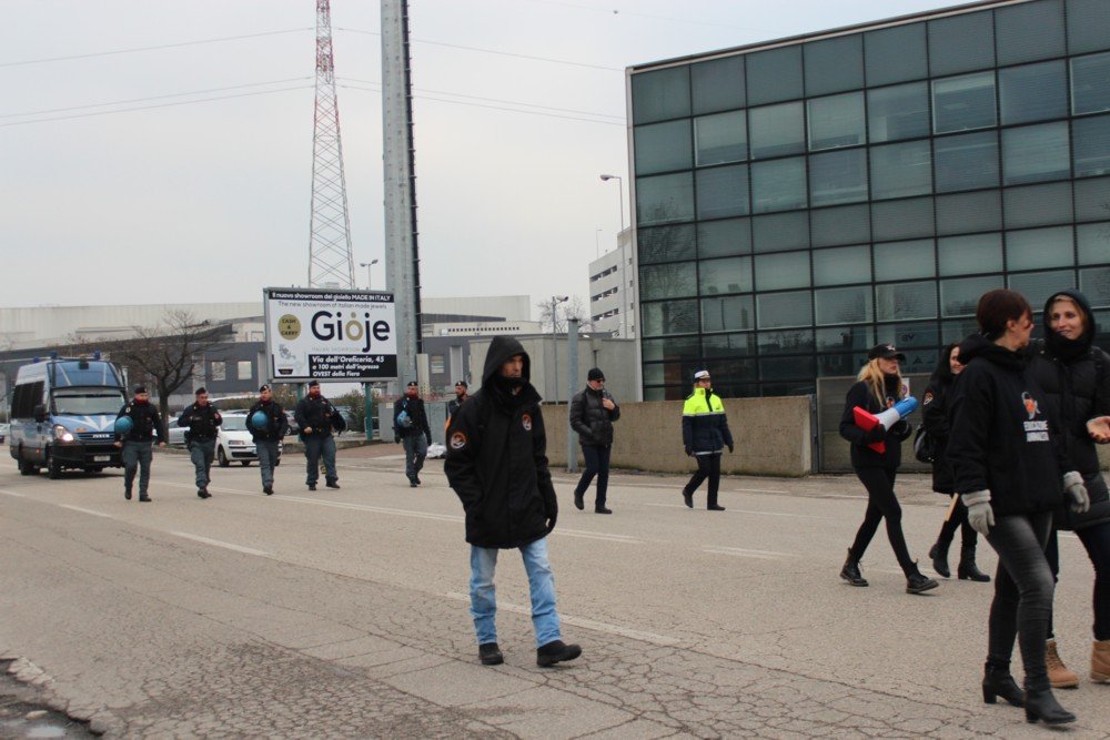 Sabato 13 febbraio si è rinnovato lo storico presidio di CENTOPERCENTOANIMALISTI alla fiera della caccia e della pesca, presso l’Ente Fiera di Vicenza. Per quasi tre ore, circa trenta militanti hanno coperto di cori i beoti che entravano o uscivano dai padiglioni. Qualche caccia/pescatore si è permesso di reagire con gesti o parole, naturalmente a debita distanza, ed è volato dal presidio qualche pomodoro e qualche rotolo di carta igienica. Notevole la blindatura di Polizia e Carabinieri, con lo schieramento di una dozzina di vetture e gipponi.