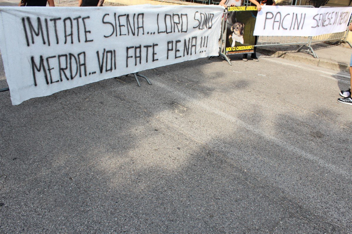 Quando si capirà che le corse di Animali, che qualsiasi uso degli Animali per il divertimento umano sono immorali e fuori del tempo, e da abolire? Da segnalare attimi di tensione alla fine del presidio tra i nostri militanti e alcuni contradaioli attempati di Urbana, comune rappresentato dal fantino senese Pacini, per l’appunto.