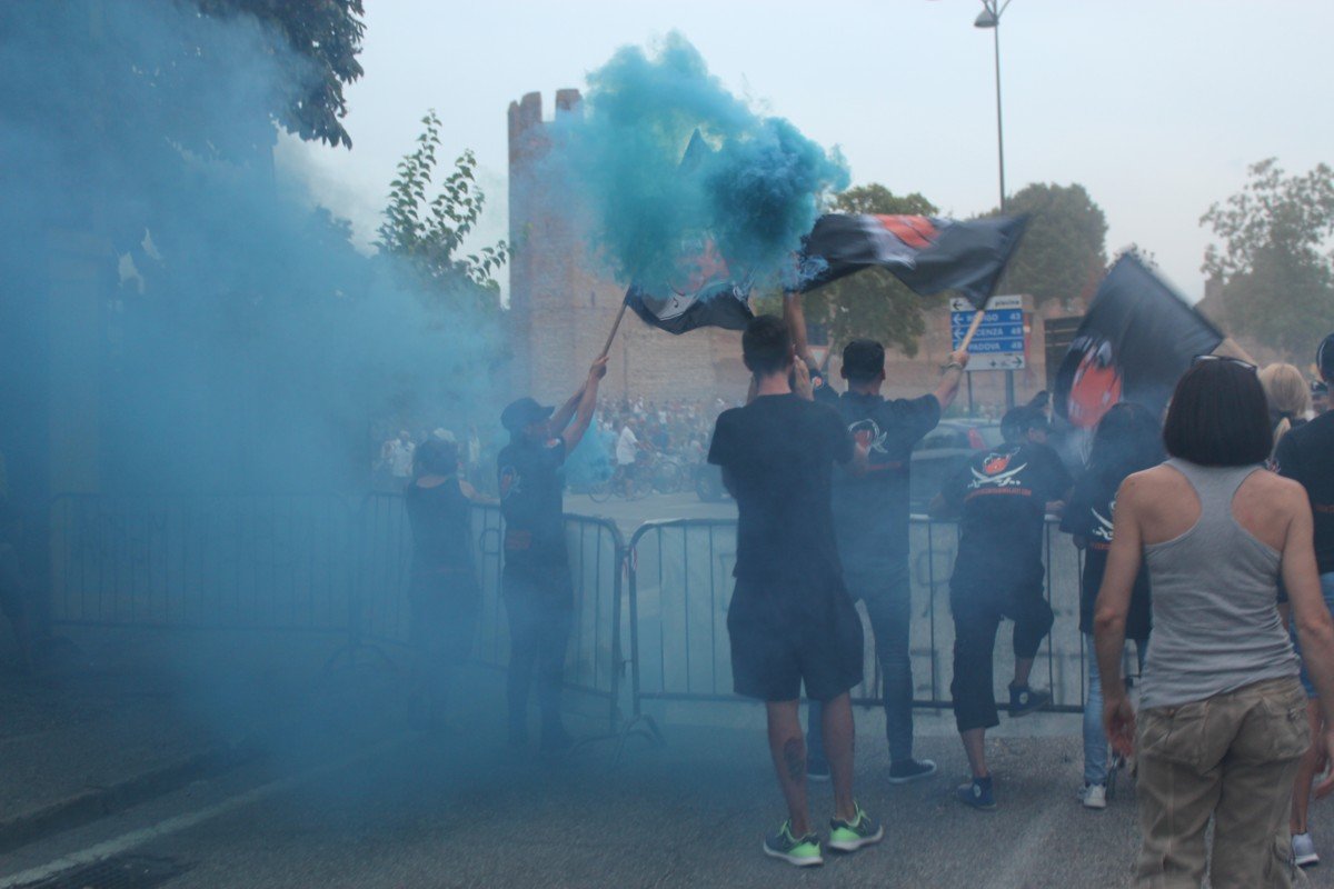Scarso il pubblico, gli spalti quasi vuoti e soprattutto una demotivazione totale: un’aria deprimente, degna di un funerale, segno evidente che oltre dieci anni di presidi di Centopercentoanimalisti abbiamo portato dei risultati. Ci si chiede che senso abbia mantenere in vita questi palii, che sono solo uno spreco di soldi e sofferenza e rischio per i Cavalli. Questi ultimi sono stati tenuti per lungo tempo al cavo di partenza, sotto il sole, in una giornata afosa, mentre il mossiere li faceva andare avanti e indietro, cercando di imitare gli squallidi rituali del palio peggiore di tutti: quello di Siena, il palio assassino.