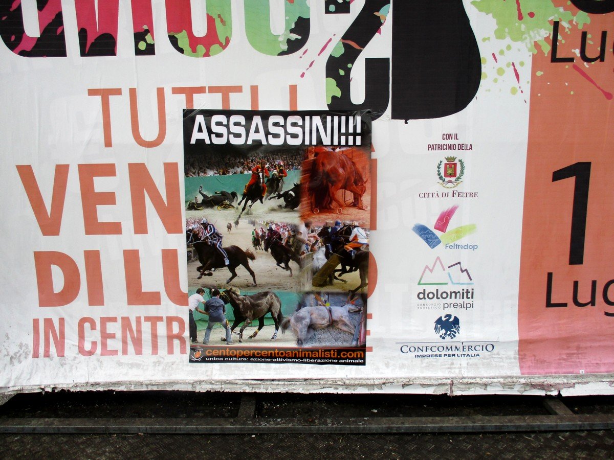Domenica 5 agosto militanti di CENTOPERCENTOANIMALISTI erano presenti a Feltre (BL) per un presidio contro il palio, la corsa di Cavalli all’interno di una rievocazione storica. Presenti come ogni anno, dal 2007 : l’anno prima due Cavalli, furono uccisi per le ferite riportate in pista.