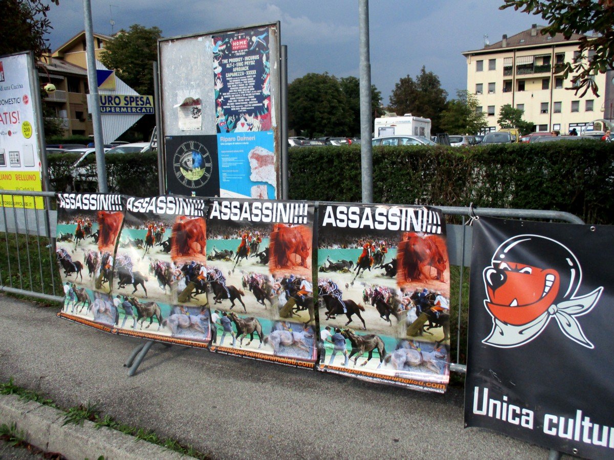 Il presidio, oltre che richiedere l’abolizione di queste corse assassine, vuole anche ricordare i due Cavalli morti: Metz e Ghisellin. I loro nomi, la notizia stessa sono spariti dalla cronaca dei quotidiani locali. Nessuno dei pennivendoli al servizio dei politicanti locali e degli organizzatori del palio, ricorda mai questo fatto “scomodo“, che è stato semplicemente fatto sparire. E questo i nostri militanti lo hanno gridato ben forte domenica.