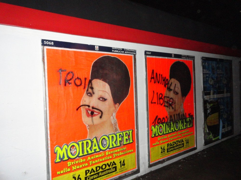 Ma la cosa notevole è stato il numero scarsissimo di spettatori, a entrambi gli spettacoli. Padova non è terra buona per i circensi, ormai dodici anni di presidi e altre azioni anticirco hanno demotivato gran parte del potenziale pubblico. Il calo enorme di presenze dimostra come azioni determinate e ben ideate abbiano il loro effetto, a differenza delle “cerimonie” con pupazzi e persone in silenzio. Moira, icona del peggior sfruttamento di Animali nel circo, deve sapere che la sua permanenza a Padova non sarà tranquilla.