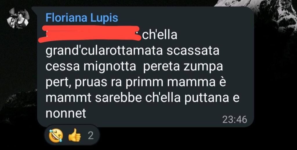 Questa la traduzione del messaggio scritto in dialetto Napoletano: “quella grande rotta in culo scassata cessa mignotta puttana di tua madre, la prima, puttana è la madre di tua madre, cioè quella puttana di tua nonna”