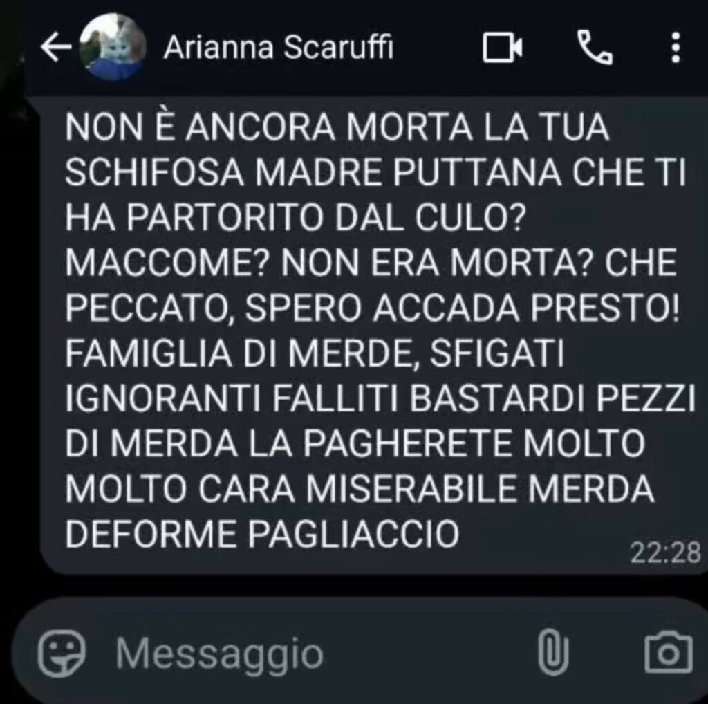 Per non dimenticare anche il messaggio di ARIANNA SCARUFFI (disagiata che ha ucciso un Cane, che ha rapito un Gatto facendolo soffrire per una settimana, che ha consegnato un Gatto a stranieri senza preaffido, di cui si sono perse le tracce) rivolto ad una mamma 80enne allettata in ospedale che morì alcuni giorni dopo…