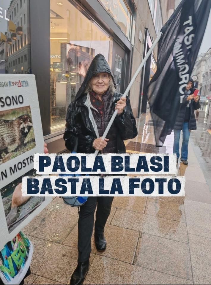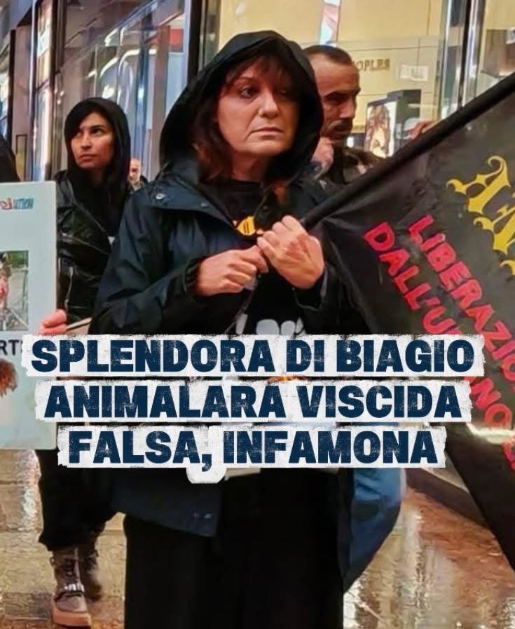 VIDEO di SPLENDORA DI BIAGIO (nome falso) che visita (pagando l’ingresso, quindi finanziando gli aguzzini) una fiera di Animali schiavizzati, ma dopo un po’ si stanca e se ne sbatte, perché vuole andare a bere un Gin Tonic. Solo nel fronte degli scarti poteva essere accolta. In questo video si nota tutto il suo “animalismo”. Questa è una delle tante donne frustrate, lecchina e falsa, che ha trovato un modo di socializzare e sentirsi protagonista nel mondo animalaro, ridotta a farsi centinaia di Km (dalle sue parti hanno iniziato a conoscerla), pur di sentirsi considerata, con noi ha provato ad infiltrarsi, ma è durata un paio di eventi, la puzza la sentiamo praticamente subito.